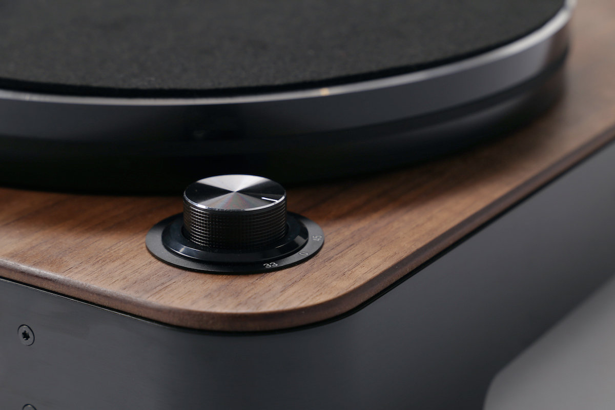 Bleiben wir zunächst bei Design und Formensprache des neuen Plattenspielers aus dem hohen Norden. Sehr wertig und exklusiv präsentiert sich die Verbindung der Werkstoffe Holz, Aluminium und Karbon. Das Holz-Chassis ist mit akribischer Präzision (Toleranz von 0,1 mm) aus einem 60 mm dicken MDF Block aus dem Vollen gefräst, absolut massiv und garantiert eine sehr elegante Optik mit hohem Wiedererkennungswert. Neben dem Nussbaum-Echtholzfurnier kann man den Plattenspieler auch in einer hochglanzschwarz lackierten Variante erwerben. Aus eloxiertem Aluminium gefertigte Blenden runden das schicke Design ab. Im Inneren verbergen sich nach klassischem Ideal konstruierte Baugruppen und modernste Elektronikkomponenten.