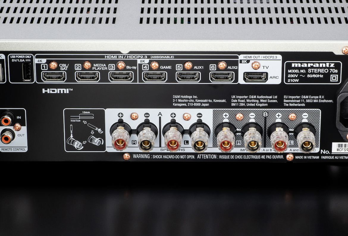 Der Marantz Stereo 70s kann dank HDMI-Eingängen und dem unterstützten Audio Return Channel völlig unkompliziert und problemlos mit Quellgeräten und einem Bildwiedergabegerät verbunden werden. Das Setup-Menü steht als On-Screen-Display und grafische Benutzeroberfläche für die komfortable Bedienung und Konfiguration zur Verfügung. Auch die umfangreiche Subwoofer-Verwaltung kann hierüber erfolgen.
