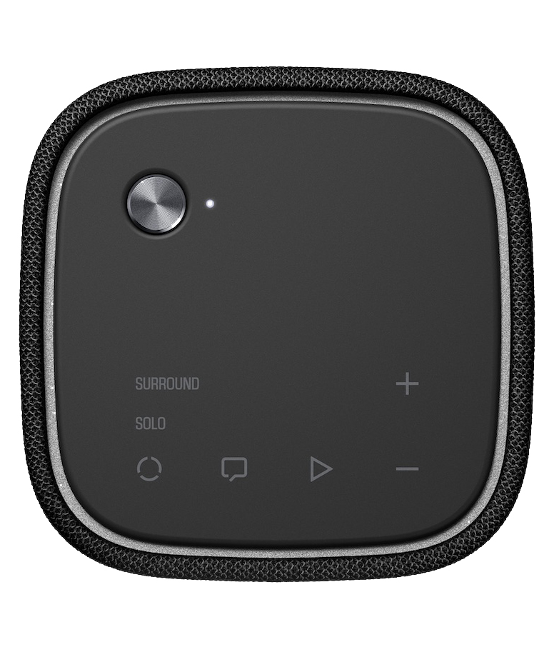 Die Bedienung erfolgt mit vier Tasten auf der Oberseite. Damit kann man die Musik stoppen und wieder starten und natürlich die Lautstärke regeln. Eine weitere Taste schaltet den WS-X1A vom Solo- in den Surround-Modus. Sind ein oder zwei WS-X1A mit einer Soundbar der True X Serie verbunden, lässt sich die Lautstärke mit der Fernbedienung an den Abstand zum Hörplatz anpassen.