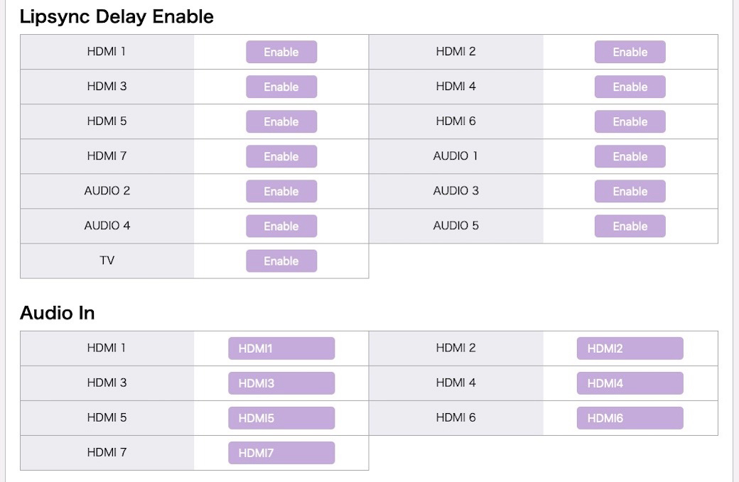 Sehr praktisch ist die Konfiguration von Szenen über das Web-Interface. Man kann hier sämtliche Parameter setzen, die beim Aufrufen einer Szene mit der Fernbedienung abgerufen werden sollen. Dazu gehören Eingangsquelle, Klangeinstellungen, Lautstärke, Lipsync Modus, Lautsprecher-EQ, etc. Insgesamt ist dies für 8 Szenen möglich. Wer möchte, kann mehrere Szenen auch einem Eingang zuweisen, um für das identische Quellgerät unterschiedliche Einstellungen abzurufen. Das ist vorteilhaft, wenn man die gleiche Quelle für unterschiedliche Anwendungen nutzt. Die Szene-Einstellungen sind in kleinerem Umfang auch für Zone 2 möglich.