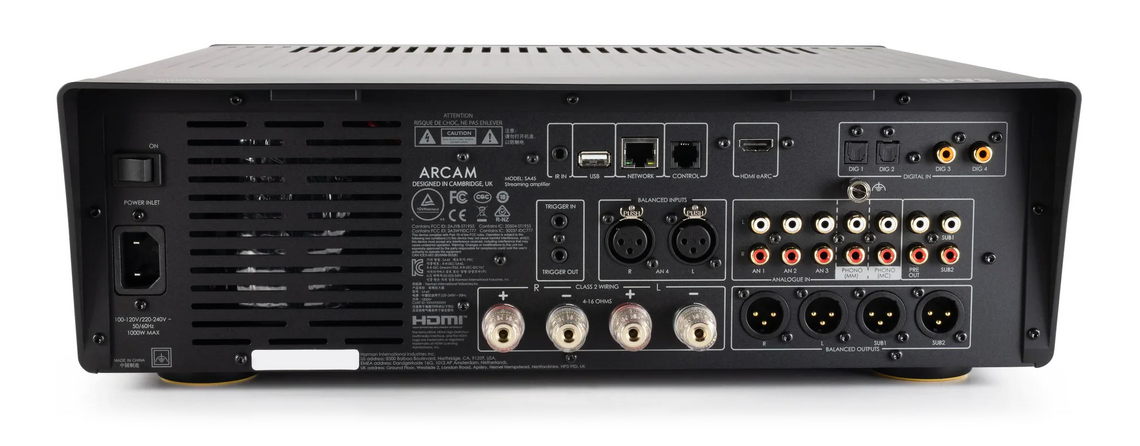 Die Arcam Radia Komponenten sind zahlreich mit tadellos eingepassten, robusten Schnittstellen bestückt. Der SA45 Streaming-Vollverstärker verfügt sowohl über Stereo Cinch-Anschlüsse als auch über XLR-Ein- und Ausgänge. Digitale Schnittstellen umfassen neben koaxialen und optischen Buchsen auch HDMI eARC sowie USB Typ A. Trigger In/Out sowie IR In sind ebenfalls vorhanden und die Lautsprecher-Terminals sind hochwertig vergoldet und gekapselt. Die Premium-Phonostufe ist sowohl für MM- als auch MC-Tonabnehmer geeignet.