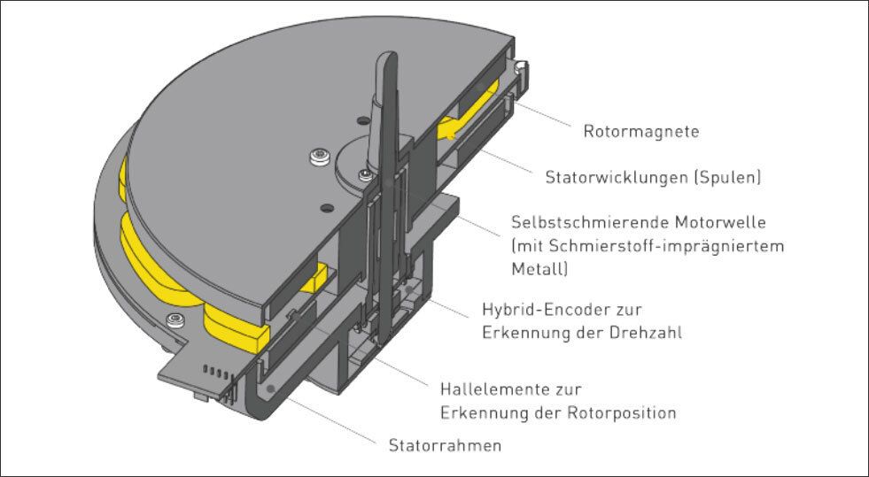 - Bessere Gleichlaufgenauigkeit: Die Abwesenheit eines Eisenkerns reduziert auch unerwünschte magnetische Unregelmäßigkeiten im Motor. Dadurch wird eine präzisere und gleichmäßigere Drehzahlregelung ermöglicht, was zu einer verbesserten Gleichlaufgenauigkeit führt.
