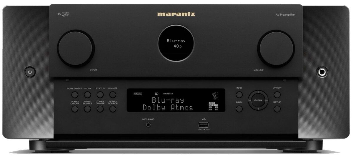 Marantz und auch Denon integrieren ab Werk das Audyssey Einmess- und Raumkorrektursystem (hier der AV 30 Vorverstärker Marantz AV30 - mit göffnerter Bedienklappe)