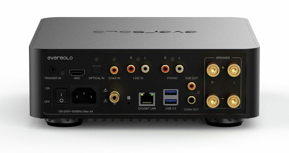 Unter den ultrakompakten Stereo-Streamingverstärkern nimmt der Eversolo Play eine wichtige Position ein – denn er präsentiert sich als überraschend hochwertig aufgebaut. Eine hochwertige Class D-Verstärkereinheit mobilisiert 60 Watt an 8 Ohm und 110 Watt an 4 Ohm, und für eine exakte digital-analoge Signalwandlung wurde ein AK4493 DAC-Chip im edel anmutenden CNC-gefrästen Aluminiumgehäuse untergebracht. In Bezug auf die Streaming-Funktionalität herrscht Vielfalt vor – beispielsweise Spotify Connect, TIDAL Connect, TuneIn Internetradio oder Amazon Music finden sich hier.