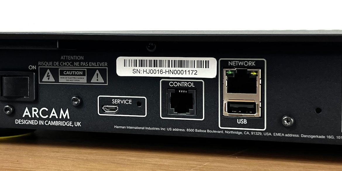 Der Arcam ST5 kann ganz konventionell per Ethernet-Kabel ins Heimnetzwerk integriert werden, verfügt aber auch über ein integriertes WLAN-Modul. Auf der Rückseite ganz links befindet sich der Stromanschluss, daneben ein Micro-USB-Slot, der allerdings ausschließlich Service-Zwecken dient.