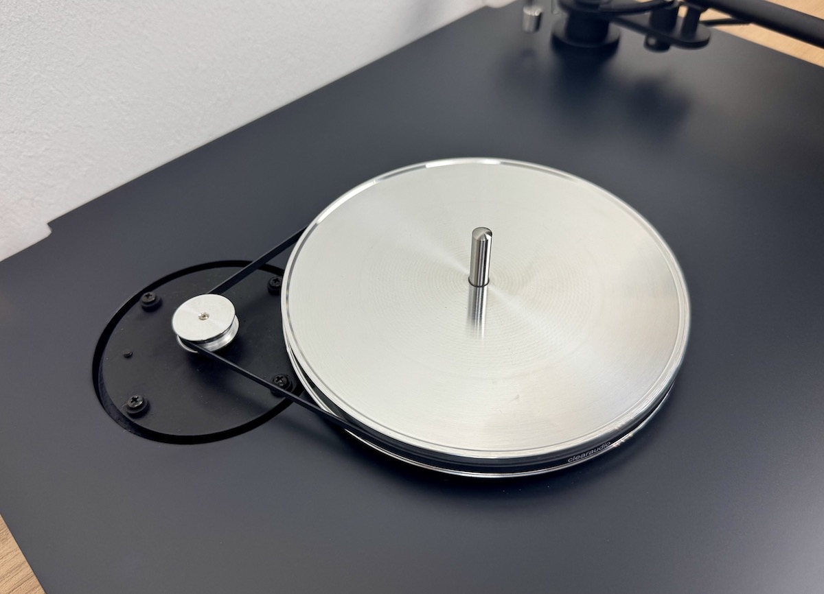 Wie kommt der compass beim Endkunden an? Er wird vormontiert geliefert, einige Schritte aber muss der neue stolze Besitzer noch selbst erledigen. Der Antriebsriemen wird um den Subteller und den Pulley des Motors gelegt, und der sehr edel wirkende Plattenteller kommt im nächsten Schritt an seinen Platz. Das Antiskating-Gewicht wird im Anschluss korrekt platziert, und die für den störungsfreien Transport vorgesehenen Sicherheitsstreifen werden von Tonarm und Tonabnehmer entfernt.