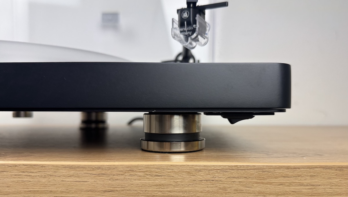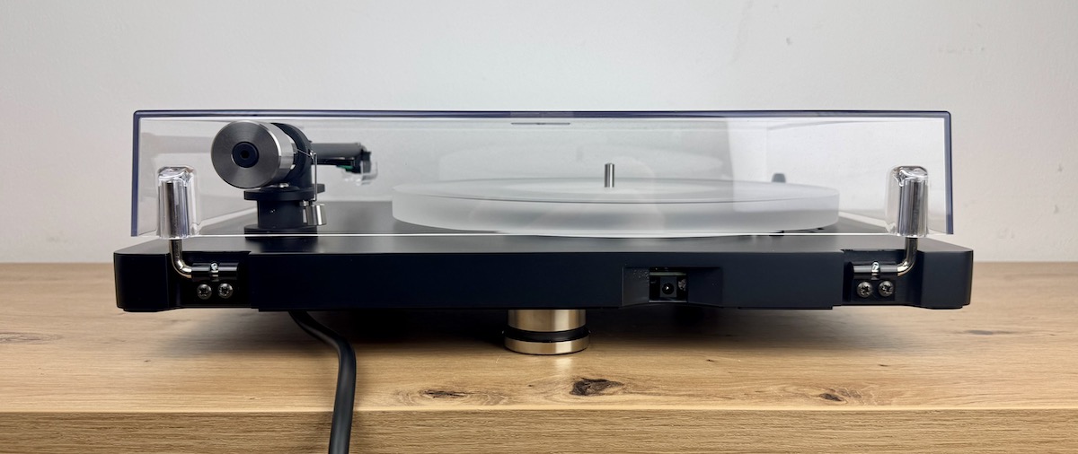 Auch die Standfüße des compass passen zum Gesamteindruck, in ihnen befinden sich Entkopplungselemente, und sie sind zudem in der Höhe verstellbar. Der Plattenspieler verfügt über einen äußerst laufruhigen und vom Rest des Plattenspielers entkoppelten 12 V-Motor, der zusammen mit einem geschliffenen Flachriemen arbeitet.