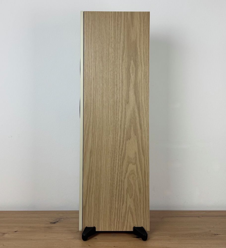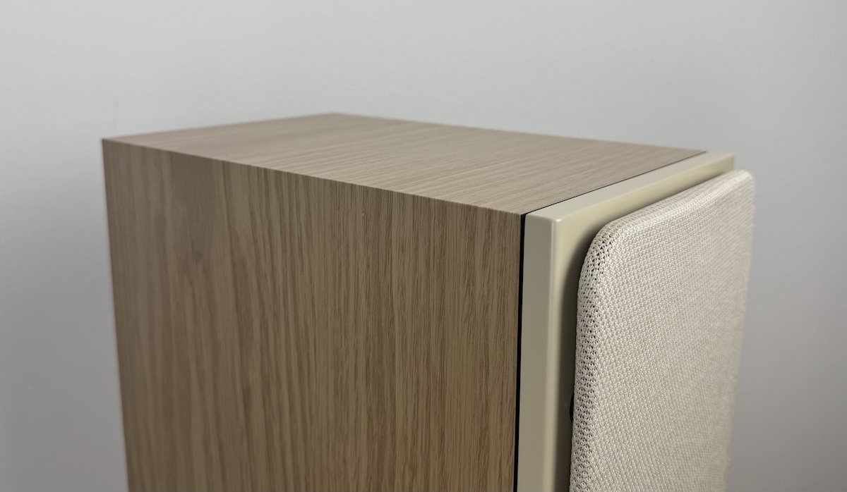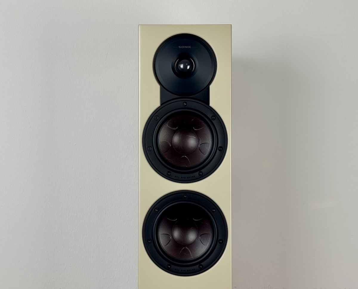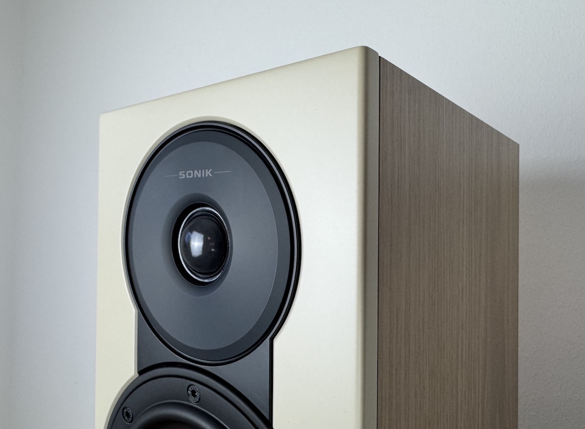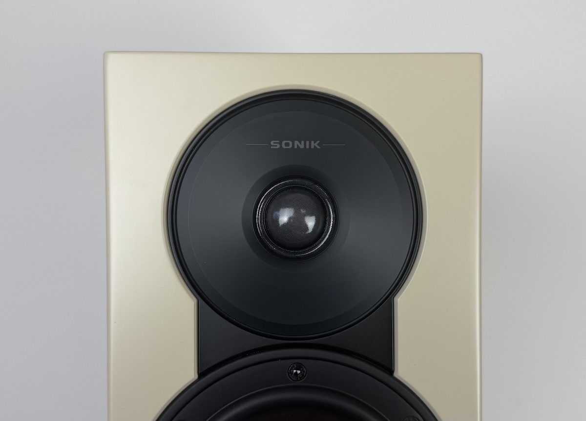 Bei den Lautsprechern der SONIK-Serie ist die Schallwand ein separates Bauteil und mit kleinem, gleichbleibenden Spaltmaß am Gehäuse befestigt. In die Schallwand ohne sichtbare Schrauben eingelassen wurde der 29 mm Hochtöner, während die beiden 13,35 cm messenden Tiefmitteltöner mit sichtbaren Schrauben eingepasst wurden.