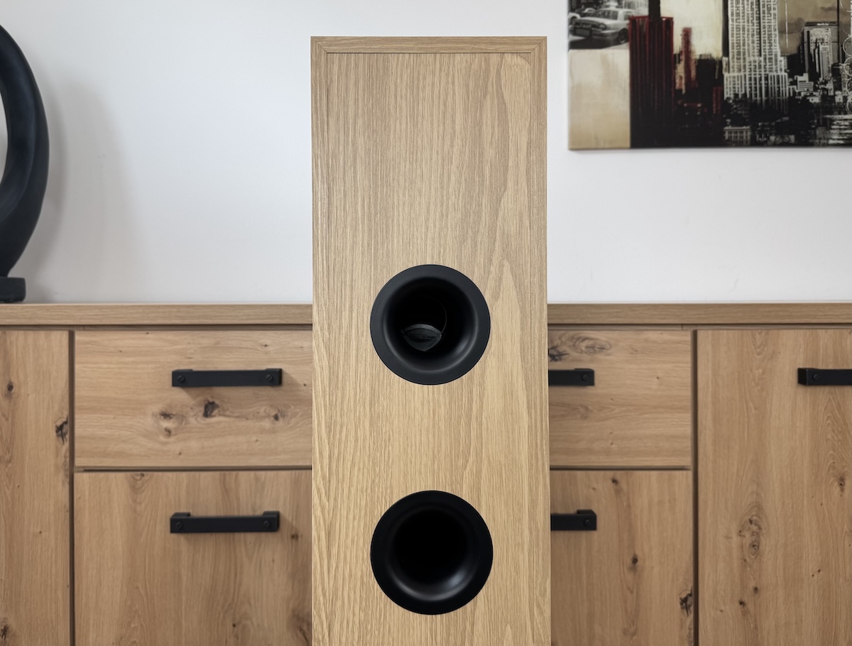 Der SONIK 9 besitzt auf der Rückseite gleich drei Bassreflexöffnungen für maximale Effizienz im Bassbereich. Die Öffnungen sind jeweils in sogenannter „Doppel-Flare-Bauweise“ ausgeführt – was meint, dass die Öffnungen sich an beiden Enden konvex verjüngen, um Turbulenzen größtenteils komplett zu vermeiden. Die Folge: Man hört praktisch keine Strömungsgeräusche, die die akustische Harmonie negativ beeinflussen könnten.