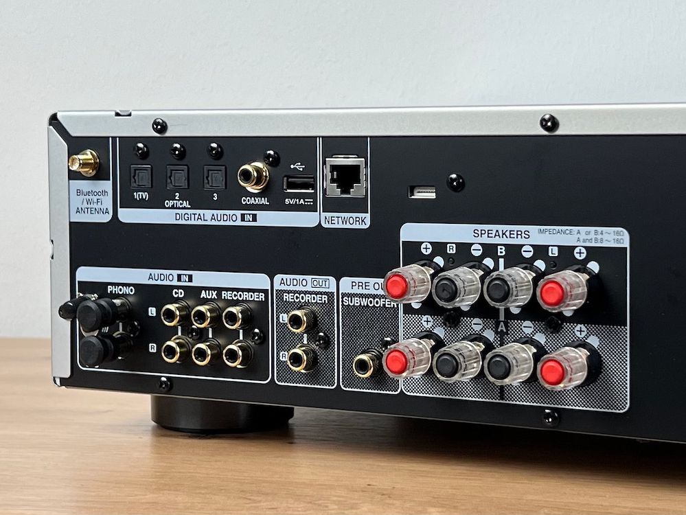 Die Anschlusssektion wirkt nicht nur hochwertig und sehr sauber verarbeitet, sondern ist auch äußerst vielfältig bestückt. An optischen Digitaleingängen sind der Anzahl gleich 3 integriert, auch ein koaxialer Digitaleingang steht zur Verfügung. Über den USB-A Slot kann man Massenspeicher mit dem Denon-Gerät verbinden, ein USB-Anschluss Typ B für die direkte Verbindung mit einem PC oder Mac hingegen ist nicht an Bord. Im Bereich darunter sind drei Stereo Cinch-Anschlüsse verbaut, daneben sitzt der Phono-Eingang inklusive Erdungsverbinder. Keinesfalls Standard in der Preisklasse des PMA-900HNE ist die Tatsache, dass sowohl MM- als auch MC-Tonabnehmersysteme zusammen mit dem Stereo-Verstärker verwendet werden können. Zusätzlich stehen ein Subwoofer Pre-Out sowie ein Stereo Cinch-Ausgang zur Verfügung. Rechts daneben sind die Lautsprecheranschlüsse montiert. Diese sind ebenfalls vergoldet, mit Acryl gekapselt und nehmen sowohl Bananenstecker als auch größere Kabelquerschnitte problemlos auf.