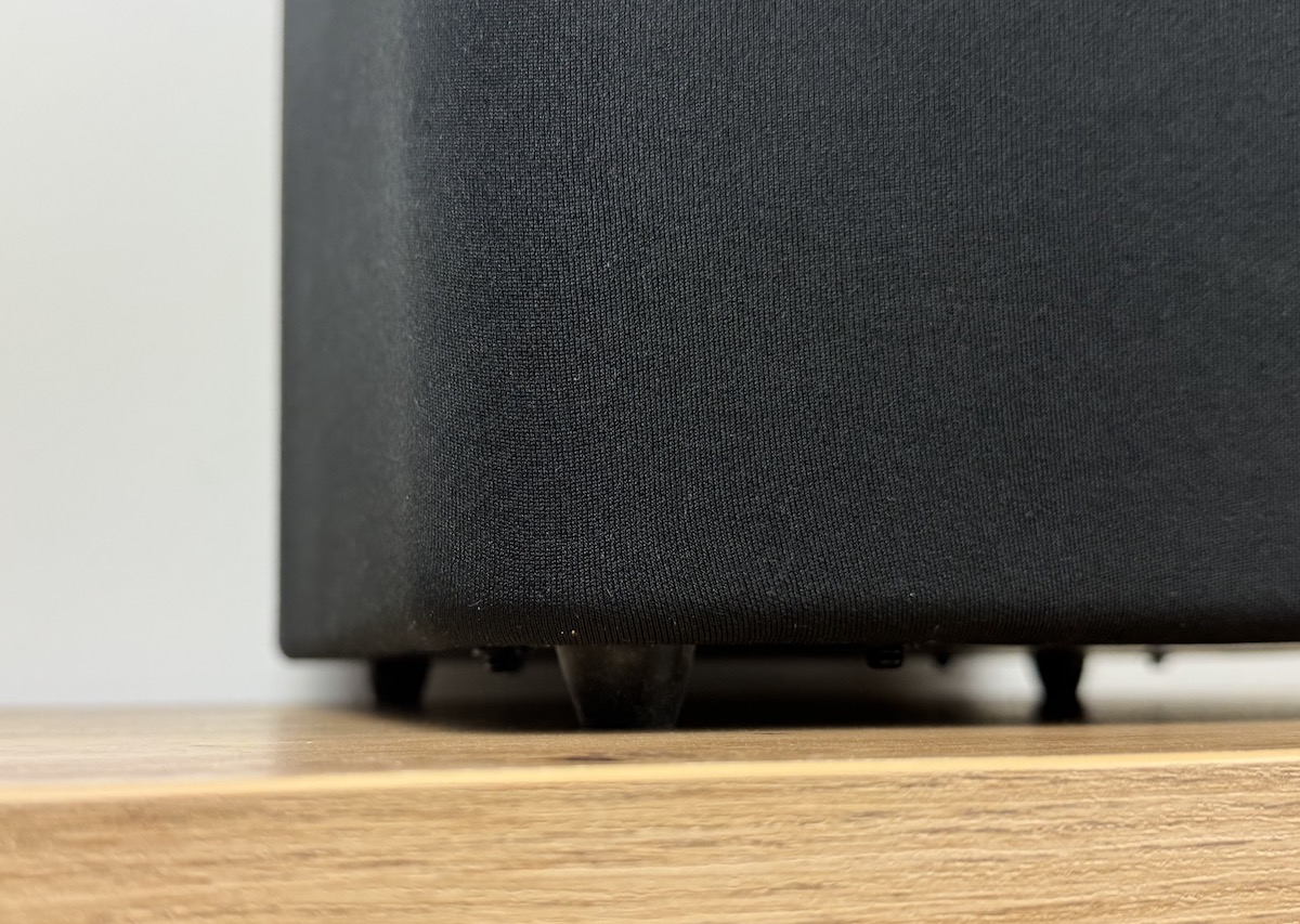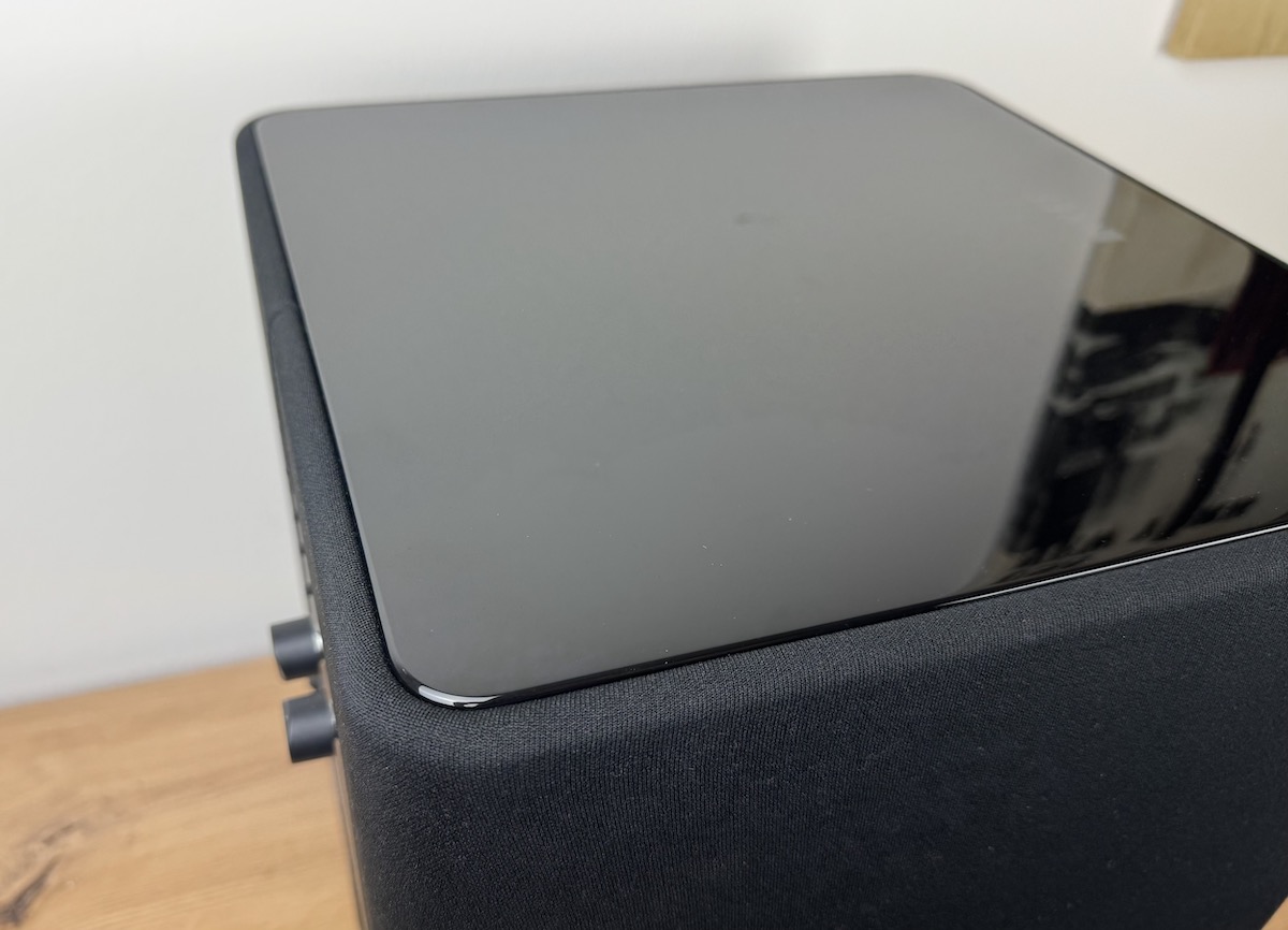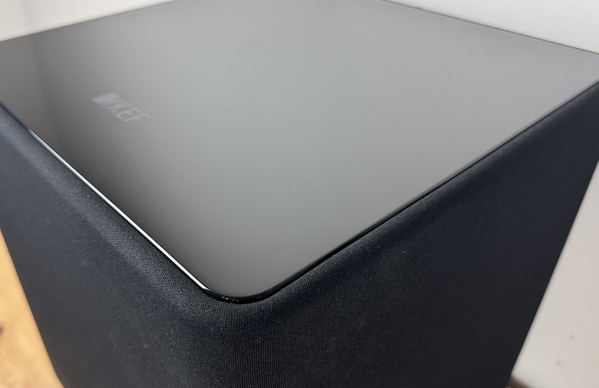 Der KEF Kube 10 MIE ist hervorragend verarbeitet und zeigt sich optisch schlicht, zugleich aber edel. Die Oberseite aus Glas mit integriertem KEF-Logo bildet einen interessanten Kontrast zum nahtlos umlaufenden Stoffbezug, der von hoher Qualität ist.