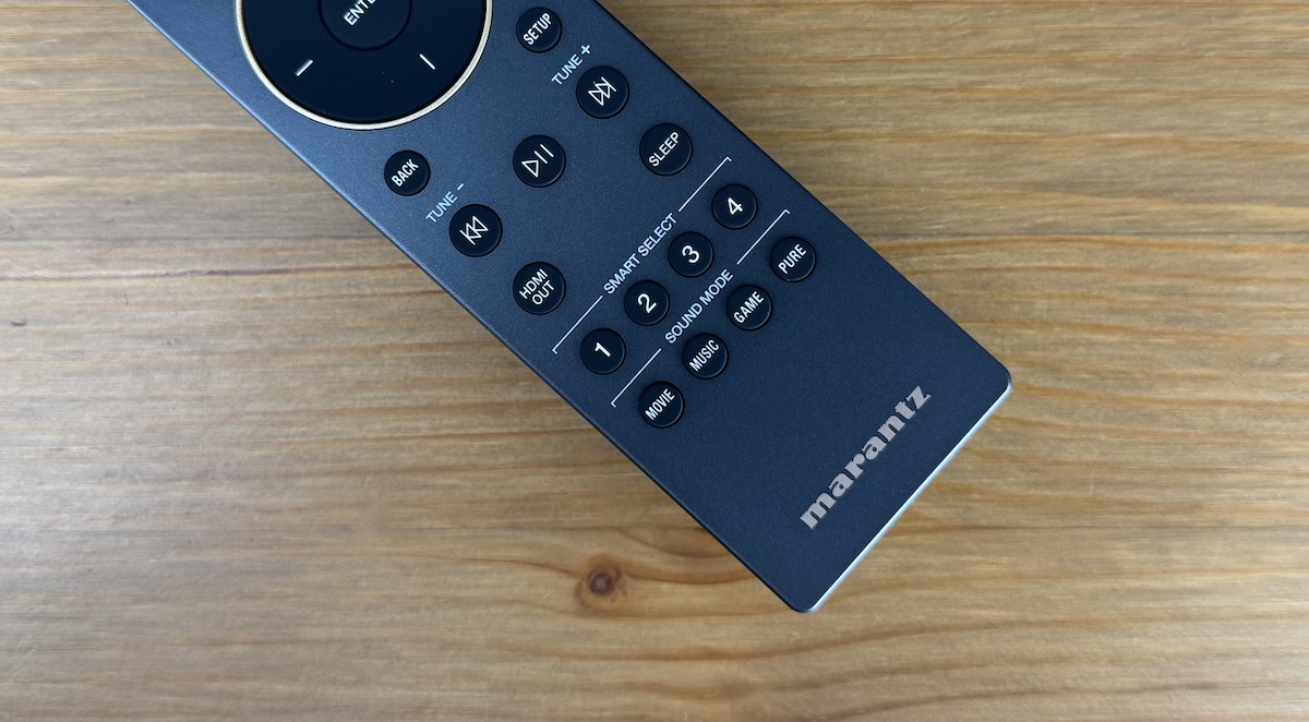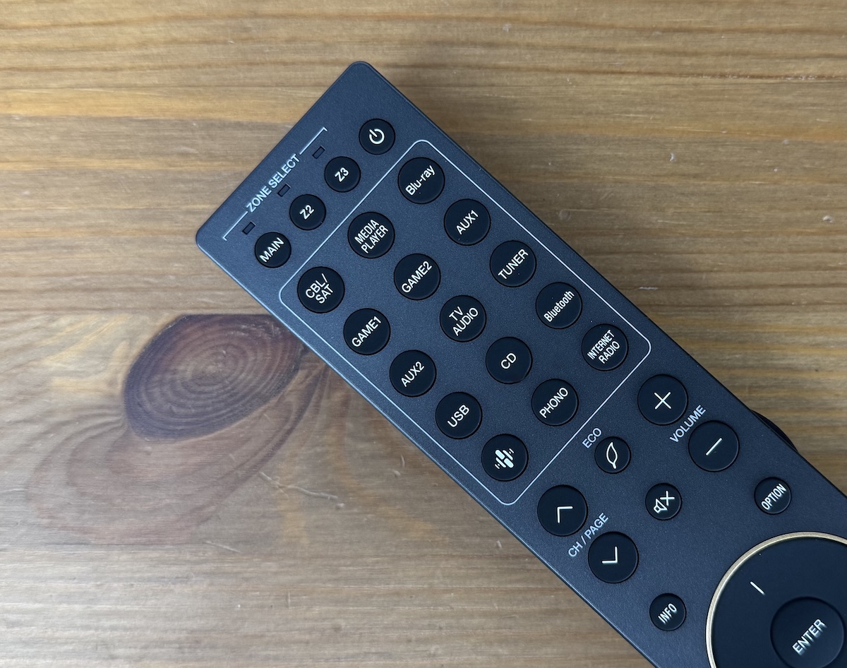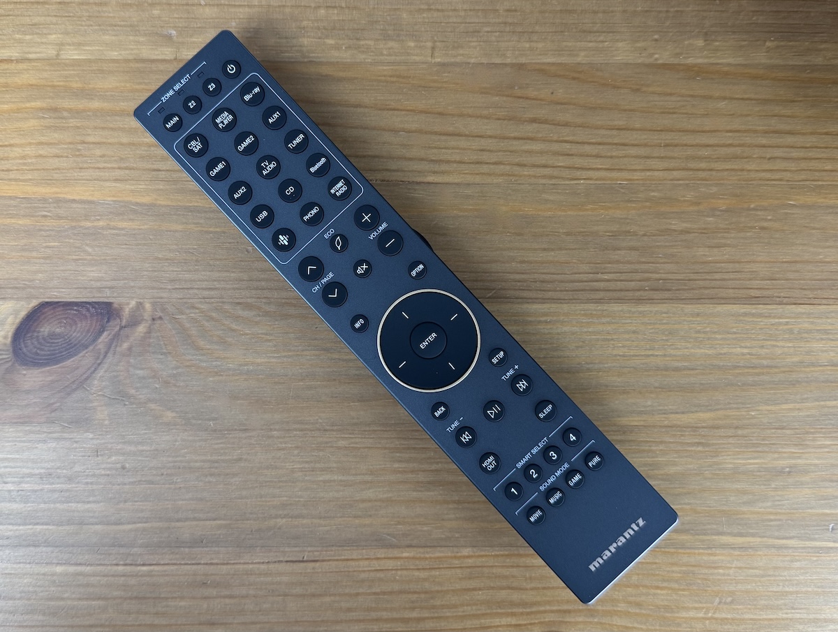 Marantz liefert eine elegant wirkende, stabförmige Fernbedienung mit, die hinsichtlich Arbeitswinkel und Reichweite ebenso überzeugen kann wie hinsichtlich des Druckpunkts der Bedienelemente. In der obersten Reihe wählt man die Zone aus (Main, Zone 1, Zone 2) und findet den Standby-Knopf. Darunter schließen sich praktische Direktwahltasten für den gewünschten Eingang an. Es folgen Wippschalter für Channel/Page und die Lautstärke, eingebettet zwischen diesen beiden Bedienelementen liegen die ECO-Taste für den besonders stromsparenden Betrieb und die Mute-Taste für die Stummschaltung.