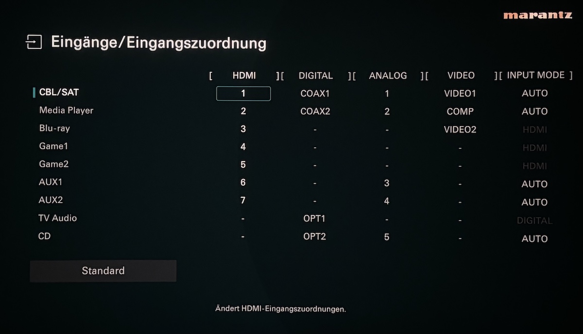 Die Anschlussauswahl setzt sich oben fort mit HDMI 1 (CBL/SAT), HDMI 2 (Media Player), HDMI 3 (Blu-ray), HDMI 4 (Game 1), HDMI 5 (Game 2), HDMI 6 (AUX) und HDMI 7 (AUX 2). Zudem sind gleich drei HDMI-Ausgänge vorhanden (4K/Zone 2, Monitor7ARC/eARC und Monitor 2). Rechts neben der HDMI-Beschaltung untergebracht wurden noch zwei eigentlich schon fast vergessene analoge Video-Anschlussformen: 2 x FBAS (CBL/SAT und Blu-ray) sowie ein Komponentenvideoanschluss (Media Player) vervollständigen die erste Reihe.