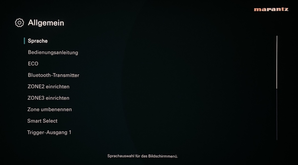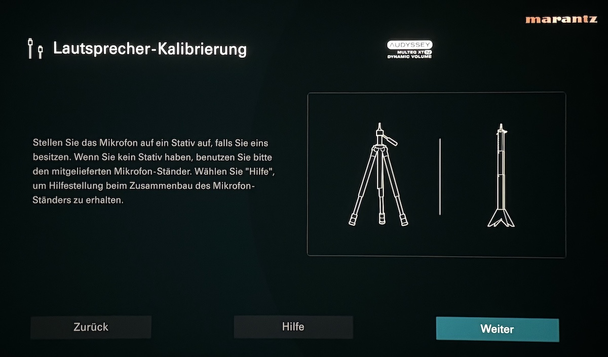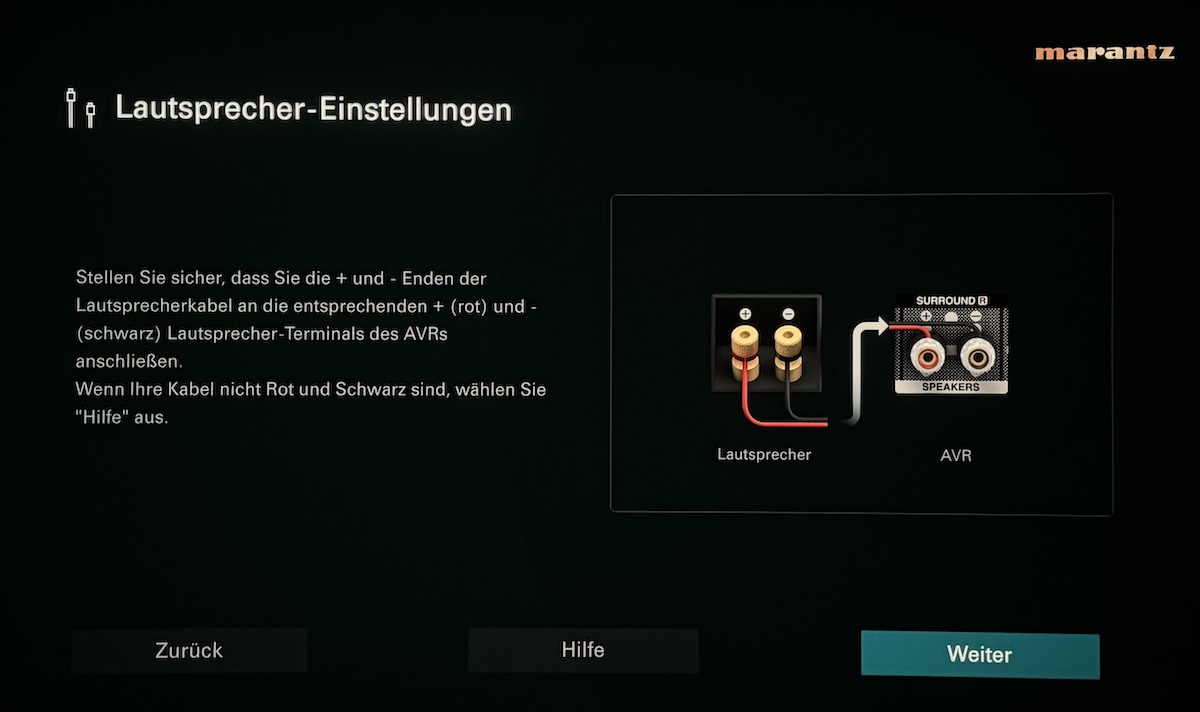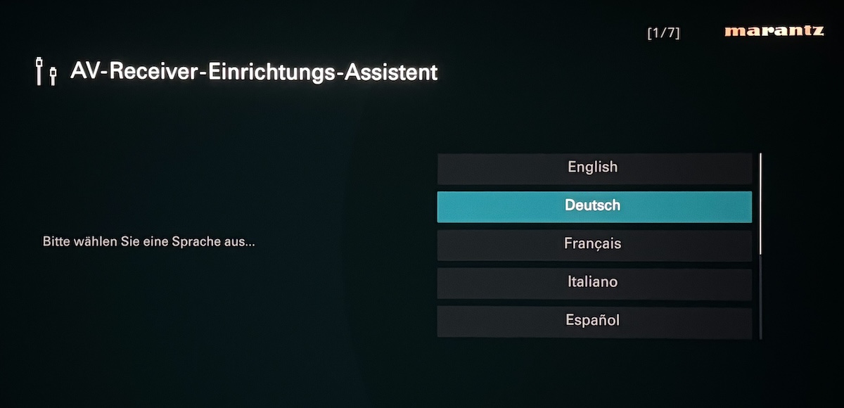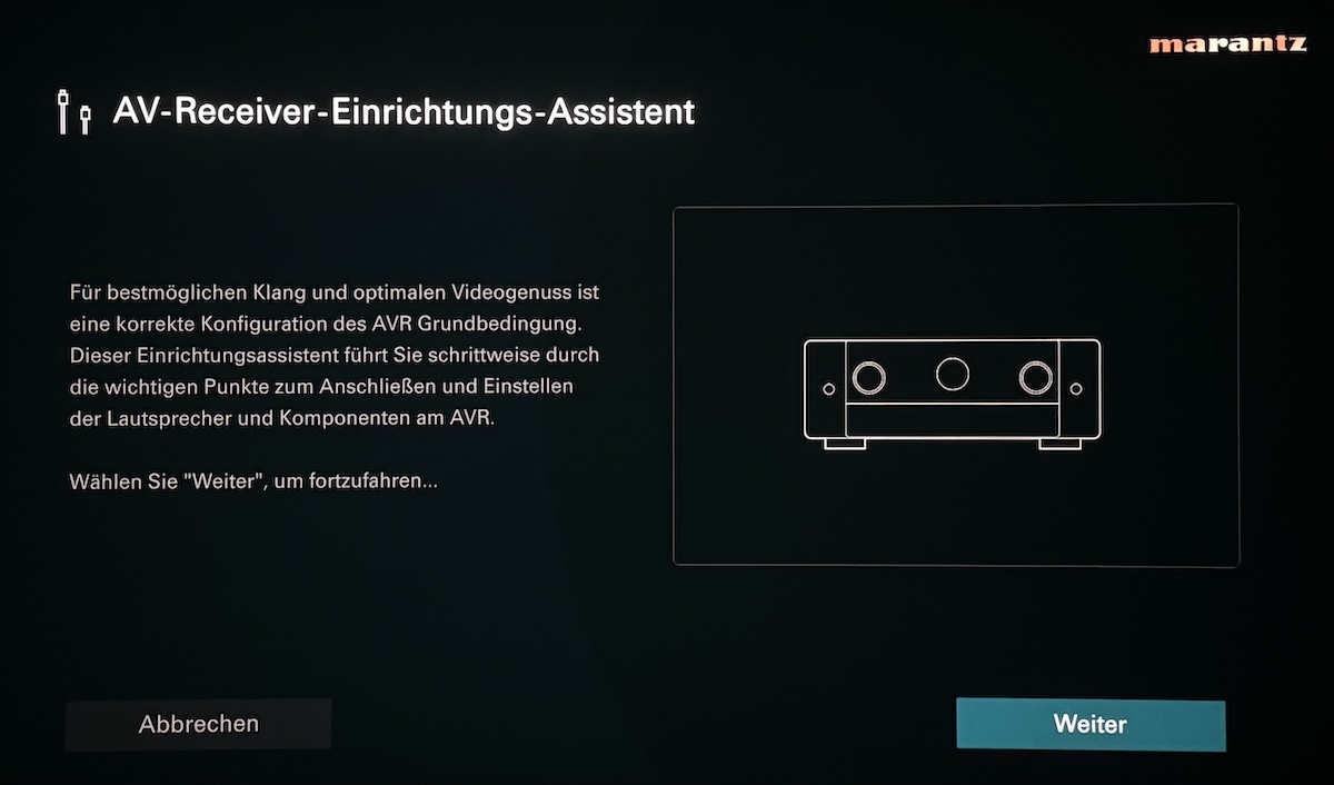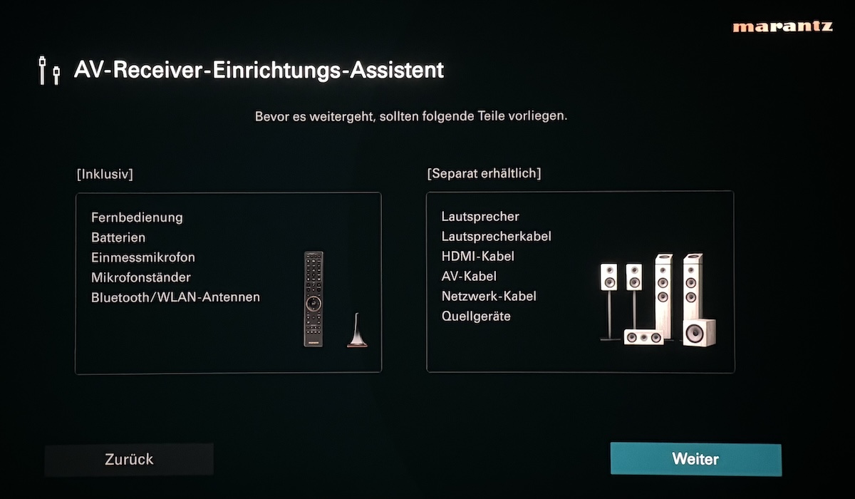 Sehr nützliches Merkmal bei den AV-Verstärkern von Marantz und Denon ist der seit Generationen vorhandene und immer weiter optimierte Assistent für die erste Einrichtung und die problemlose Inbetriebnahme. Mittels hochwertiger Grafiken inklusive begleitenden Hilfetexten wird hier der Anwender durch den gesamten Installationsprozess geleitet, und das alles mit Hilfe der hochauflösenden Benutzeroberfläche, die in verschiedenen Sprachen zur Verfügung steht. Wir wählen „Deutsch“ und legen los. Zunächst wird aufgeführt, was es alles für die Inbetriebnahme braucht, und was beim Cinema 40 zum Lieferumfang gehört.