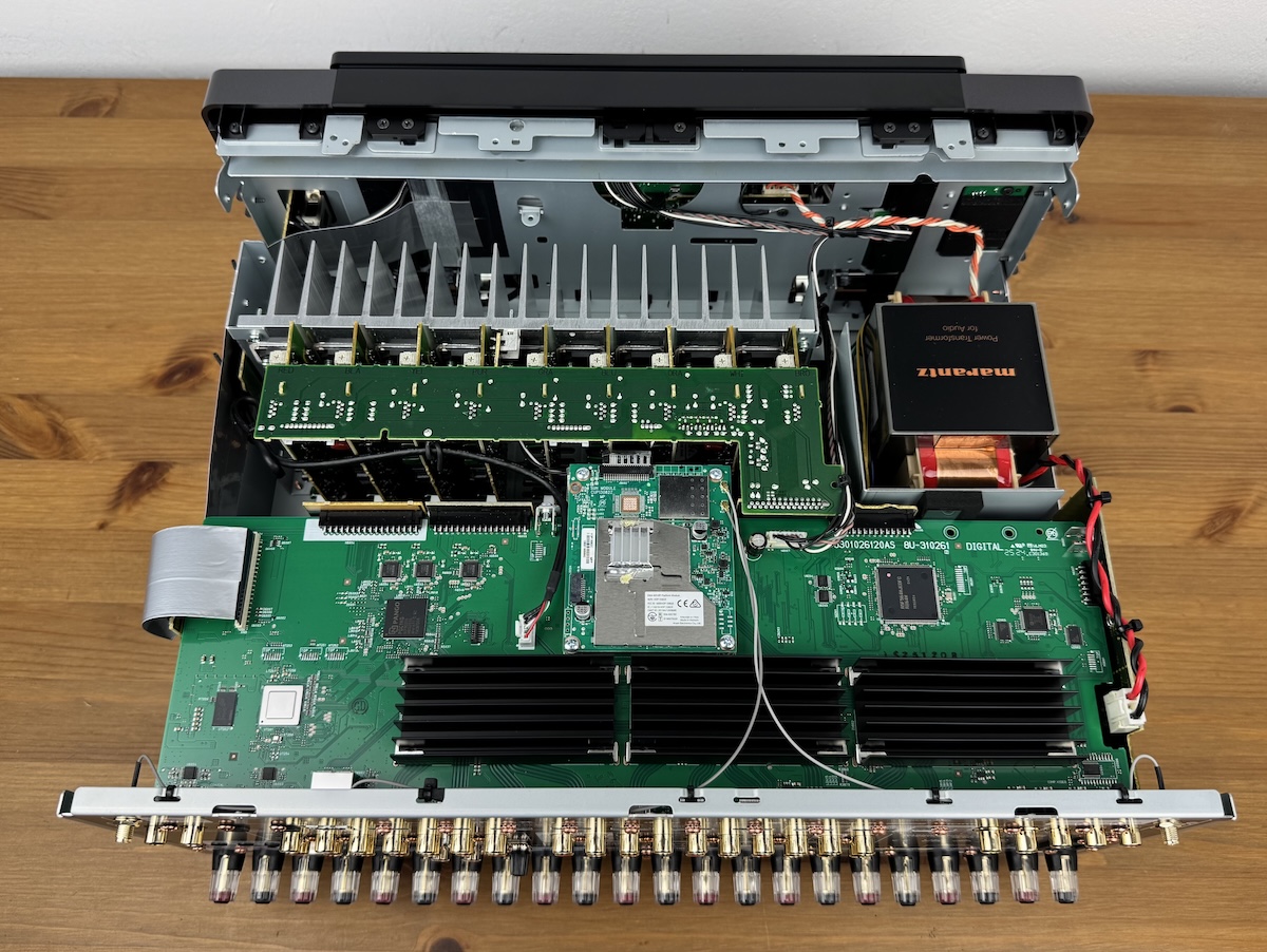 Direkt angeflanscht an einen Kühlkörper aus Aluminium sind die neun klassisch-analogen Class AB-Endstufen, die allesamt identische Arbeitsbedingungen vorfinden und somit symmetrisch aufgebaut sind. Die Leistungswerte gliedern sich wie folgt: An 8 Ohm, 20 Hz bis 20 kHz, 0,05 Prozent Klirrfaktor, 2 Kanäle ausgesteuert ergeben sich 125 Watt pro Kanal. Bei 6 Ohm, 1 kHz, 0,7 Prozent Klirrfaktor und 2 Kanäle ausgesteuert, gibt Marantz 165 Watt/Kanal an. Und bei nur einem ausgesteuerten Kanal an 6 Ohm, 10 Prozent Klirrfaktor, 1 kHz, sind es (sehr theoretische) 235 Watt pro Kanal. Für eine hohe Klangqualität sind zudem die von Marantz hausintern entwickelten Hyper Dynamic Amplifier Modules (HDAM) zuständig.