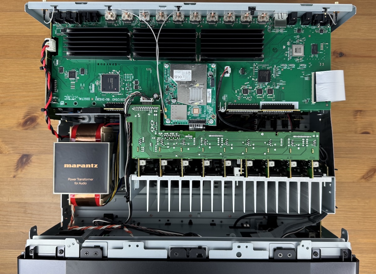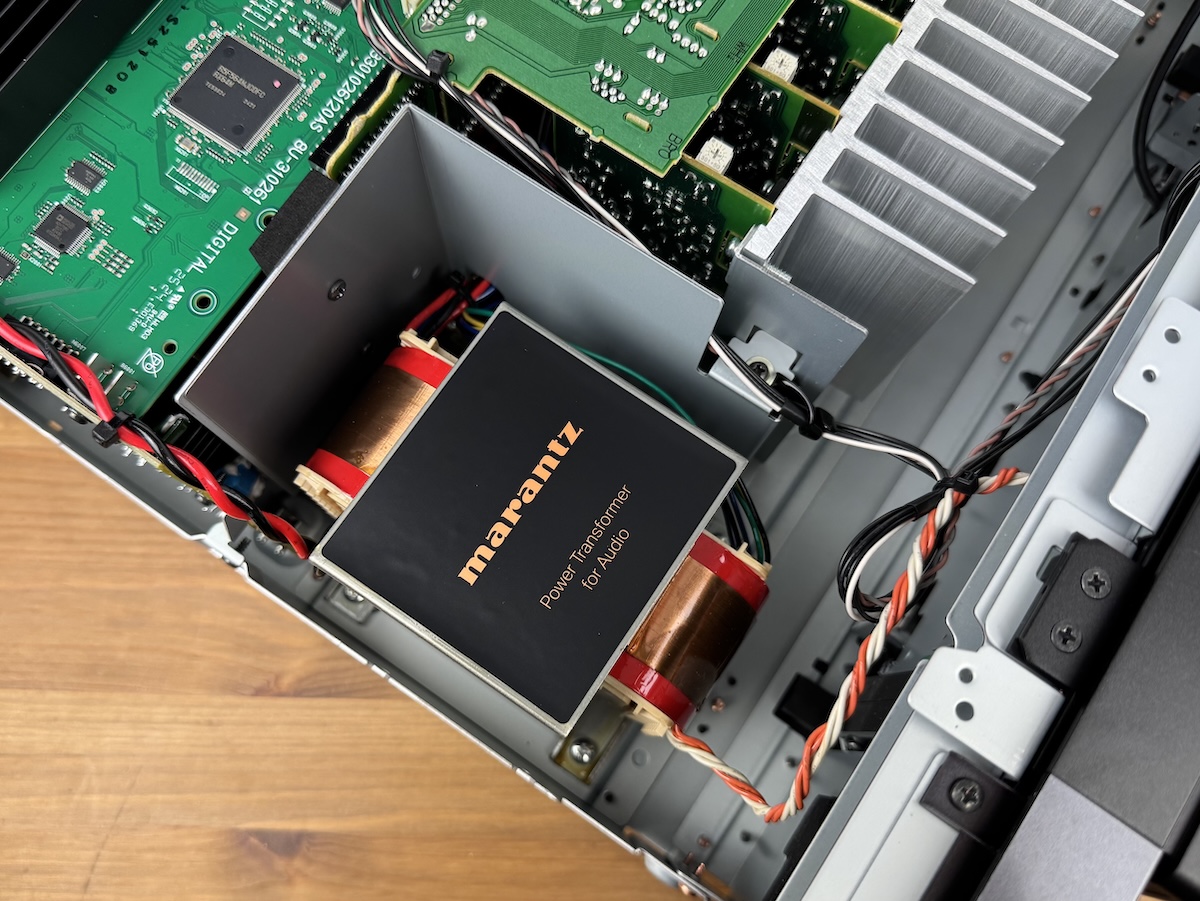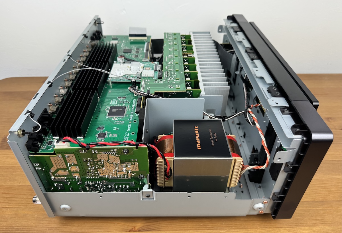 Kann man vom Äußeren aufs Innere schließen? Wo man bei Menschen höchst vorsichtig sein sollte, da sich oft gravierende Differenzen ergeben, muss man auch bei AV-Receivern und -Verstärkern genau aufpassen. Beim Marantz Cinema 40 sind größere Sorgen aber unbegründet. Ein übersichtliches Layout herrscht beim Innenleben vor, der Transformator steht, von vorne aus betrachtet, in der linken Ecke und wurde extra abgeschirmt, damit sich keine Störungen mit anderen Baugruppen herauskristallisieren können.