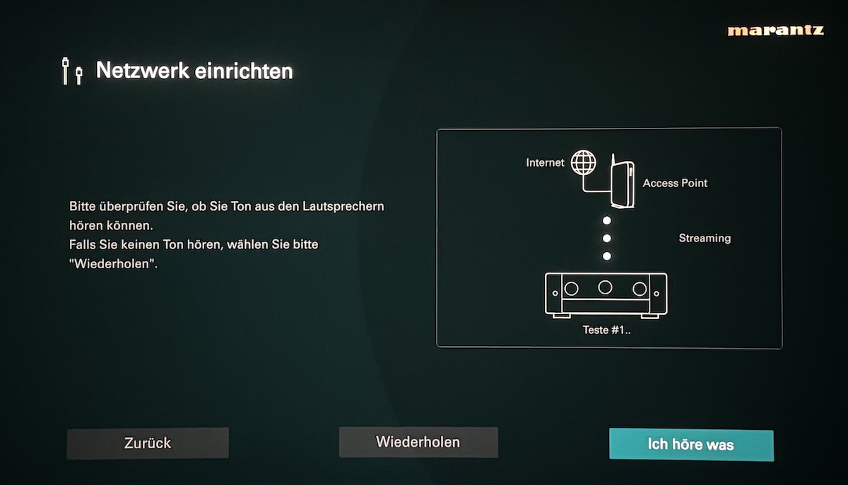 Im weiteren Verlauf wird erklärt, wie man die Lautsprecher anschließt, die Konfiguration (welches Lautsprechersetup verwendet der Anwender) wird abgefragt, und auch die automatische Lautsprechereinmessung ist in das Menü zur erste Installation integriert. Bestandteil des Installationsassistenten ist zudem die Möglichkeit, den Cinema 40 ins Heimnetzwerk einzubinden. Ebenso wird gleich die Verbindung zwischen AV-Verstärker und Smart-TV hergestellt, und angeschlossene Quellen können definiert werden.