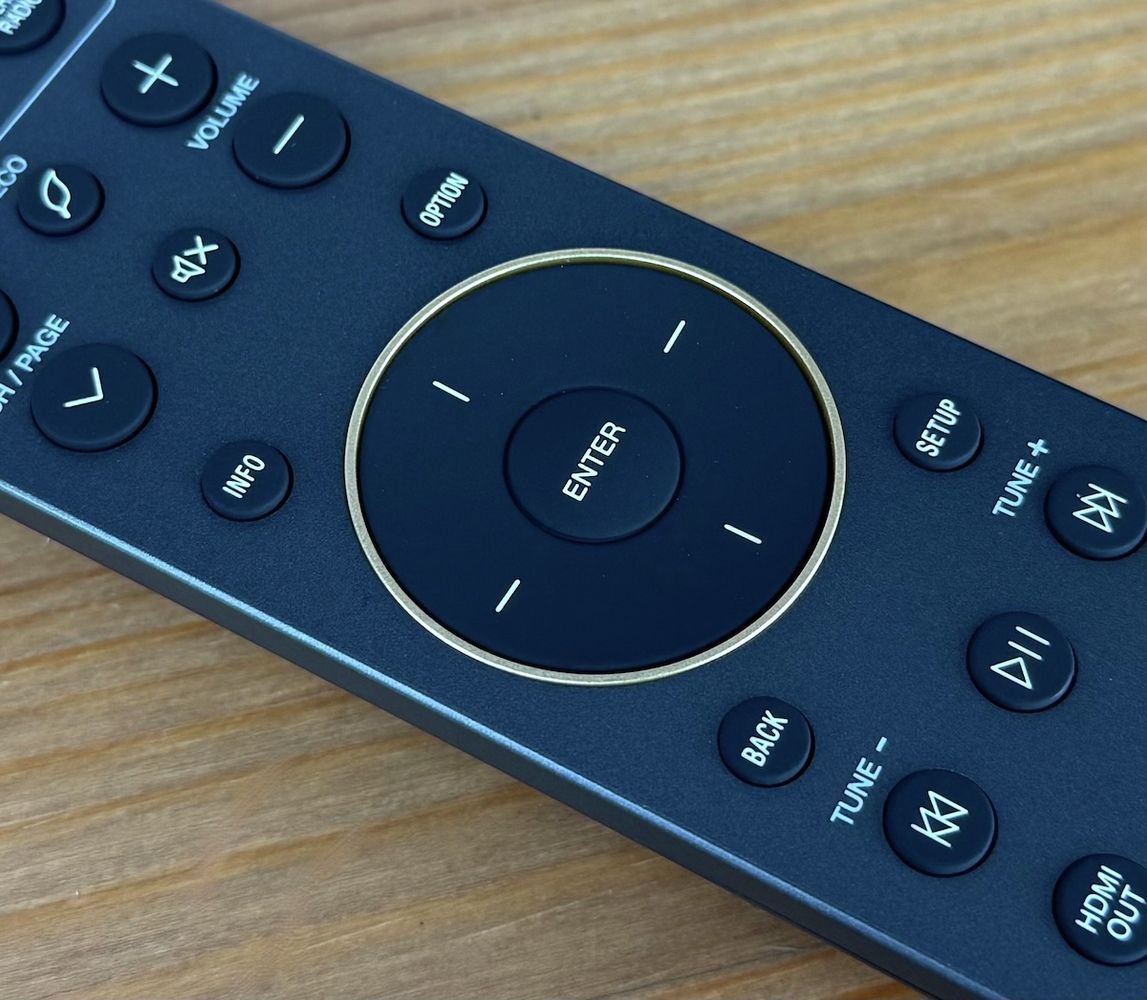 Im Anschluss kommt die griffgünstige Navigationseinheit, die wiederum von vier gleich großen, runden Knöpfen umgeben ist: Info, Option, Back sowie Setup – letztere Taste ermöglicht den direkten Einstieg ins Setup-Menü. Es schließen sich die Tasten für den elementaren Spielbetrieb an, und wieder darunter gruppieren sich die Knöpfe für HDMI Out und für den Sleep-Timer. Ganz unten untergebracht sind die vier Smart-Select-Makro-Tasten und die Knöpfe für den gewünschten Sound-Modus (Movie, Music, Game und Pure).