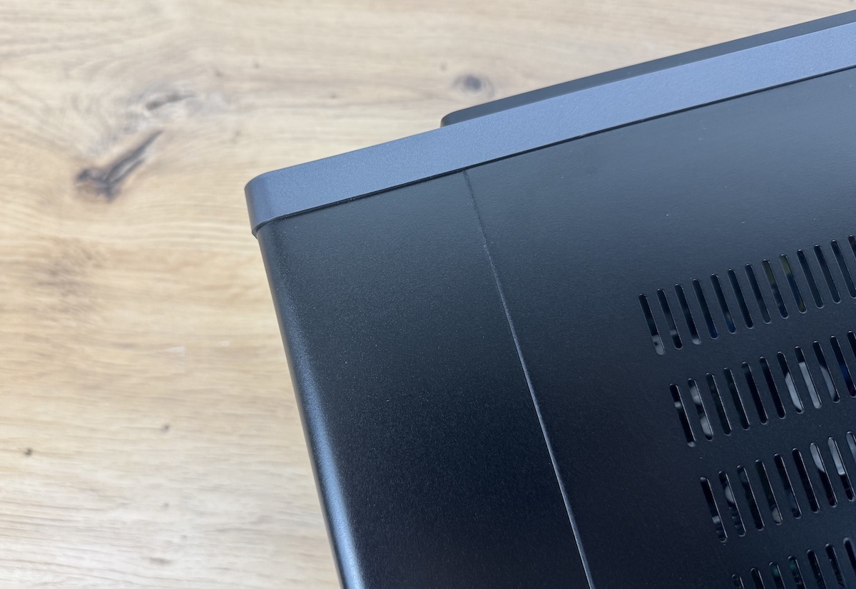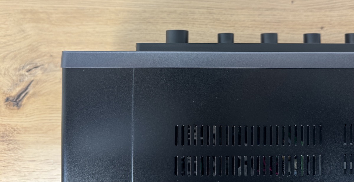 Frontseitig gehen wir von links nach rechts vor. Hier finden wir zunächst den Standby-Schalter vor, es folgt der gut in der Hand liegende Regler für die Eingangswahl. Nach diesem kommt die Auswahl des aktiven Lautsprecherpaars (Speakers A/B, Speaker A+B) per rundem Bedienelement, es folgen die ebenfalls runden Drehregler für Bass, Höhen und Balance. Die Drehregler sind allesamt hochwertig ausgeführt und vom Bediengefühl her angenehm straff.