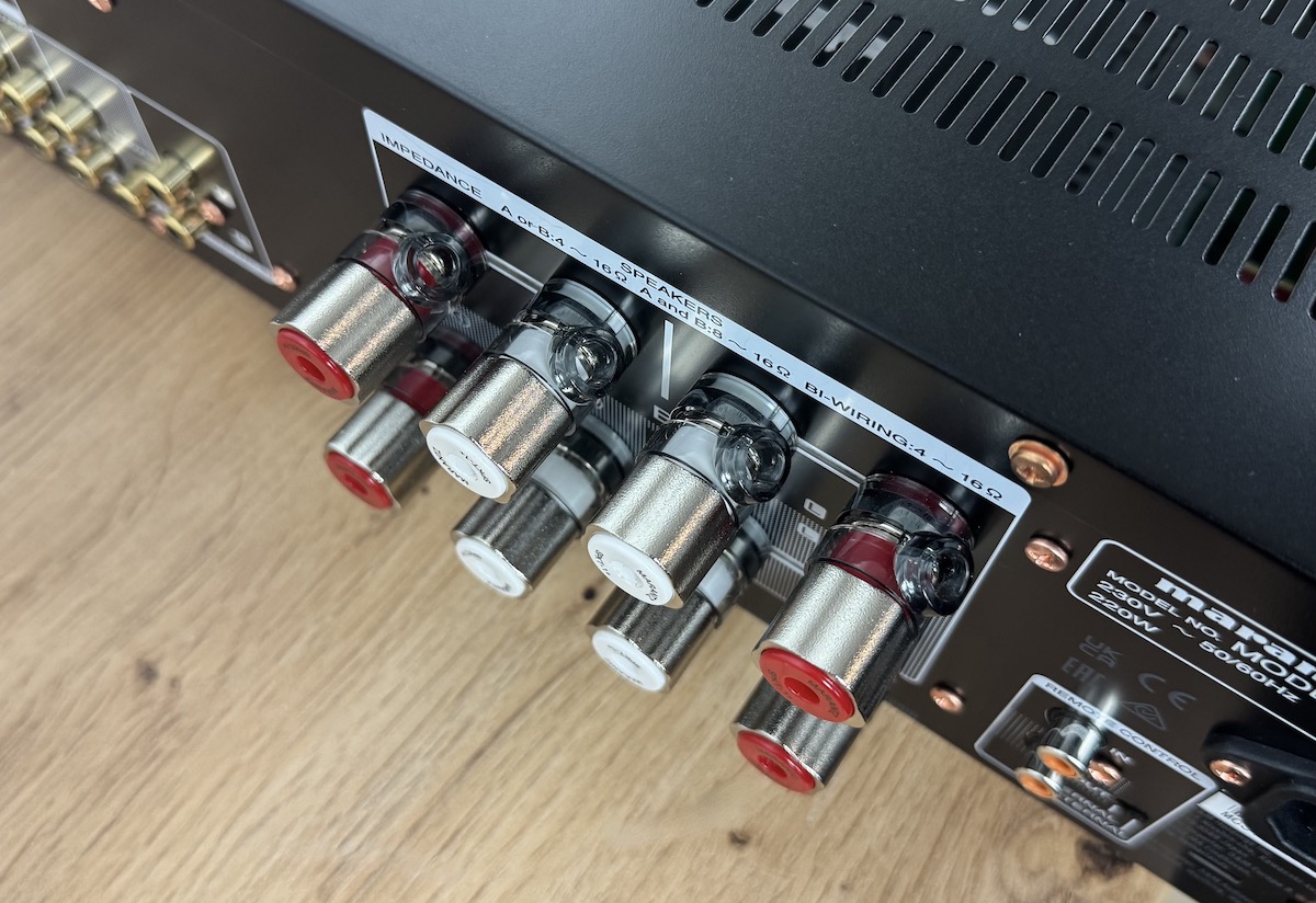 Auch auf der Rückseite zu finden sind ein linker sowie ein rechter Vorverstärkerausgang, möchte man eine nochmals leistungsstärkere externe Endstufe verbinden. Hinzu kommt ein Vorverstärkerausgang, um einen aktiven Subwoofer ins System zu integrieren. Den Marantz Model 50 kann man zudem auch als Endstufe nutzen, für diesen Zweck sind die „Power Amp In“-Cinch-Terminals. Remote Control In/Out sowie die schon angesprochenen, sehr hochwertigen, langzeitstabilen sowie leichtgängigen Lautsprecherkabel-Anschlussbuchsen vervollständigen das Sortiment.