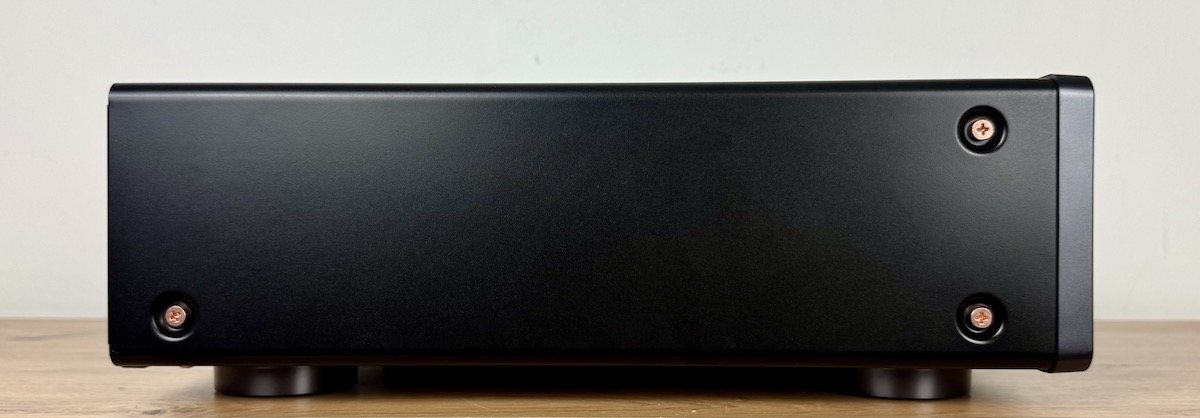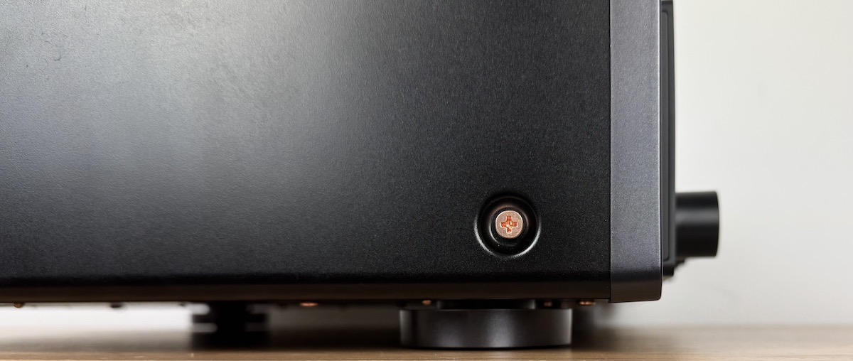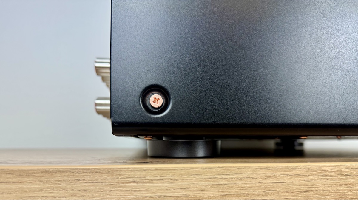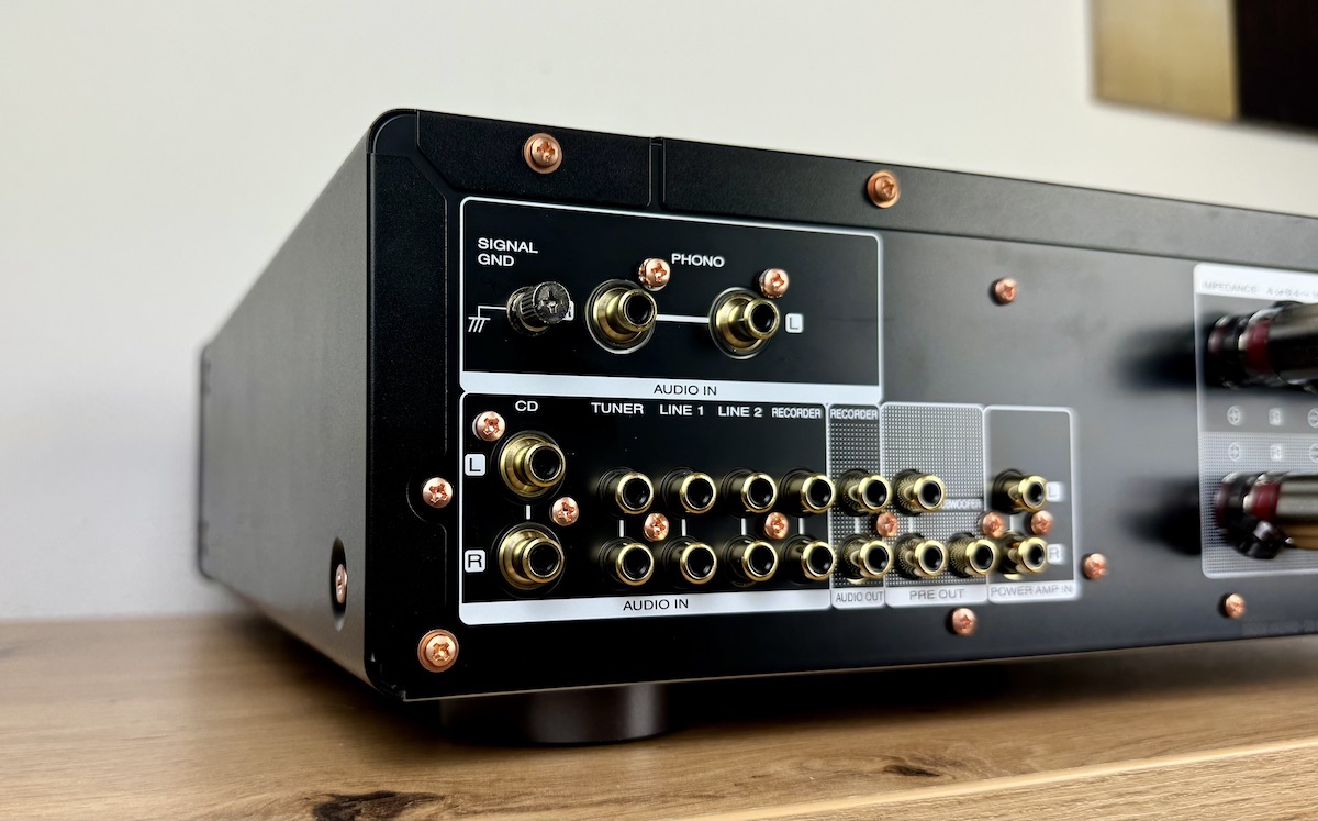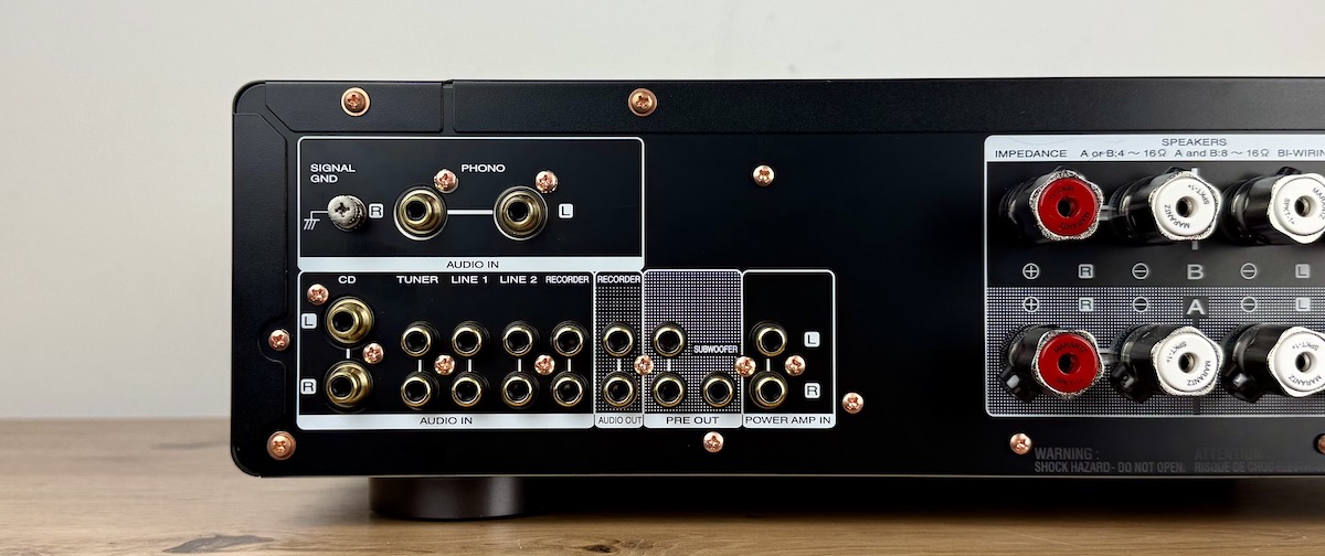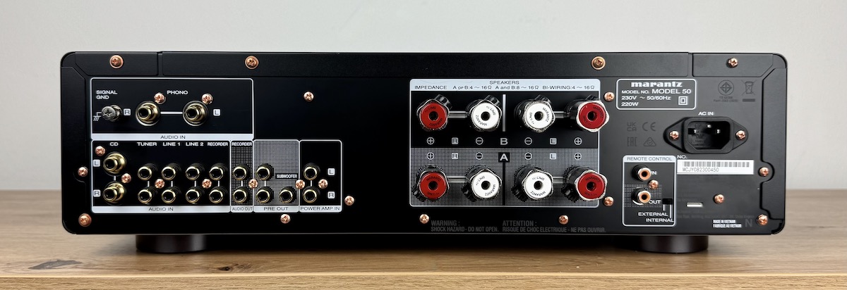 Auch die Rückseite präsentiert sich in exzellenter Qualität, die Schraubanschlüsse für die Bananenstecker oder Kabelschuhe sind überdurchschnittlich hochwertig, das gilt auch für den Cinch-Phono-MM-Anschluss. Die Seitenteile und die Rückseite wurden beim Marantz Model 50 ist mit Kupferschrauben befestigt.
