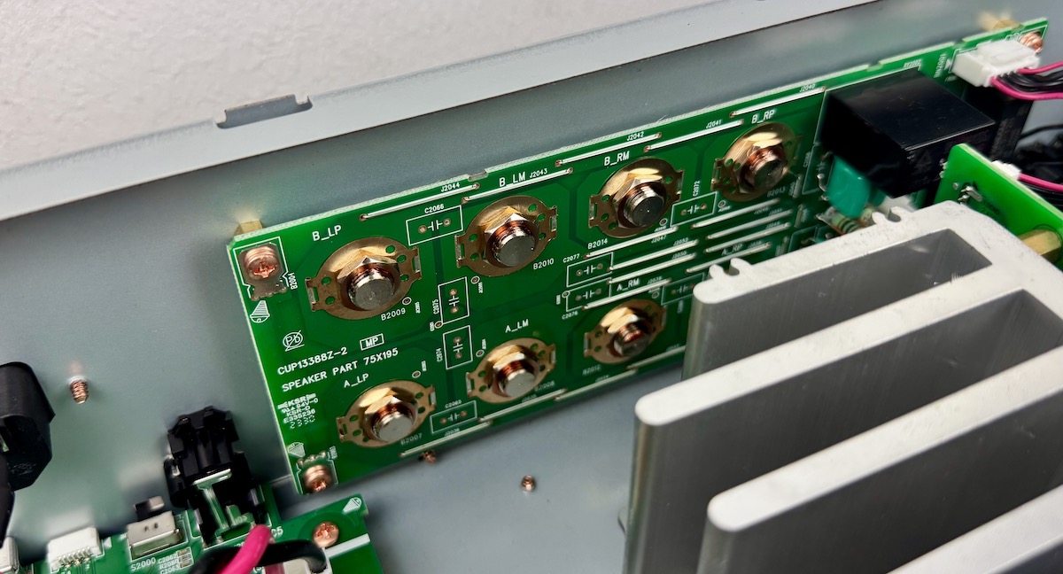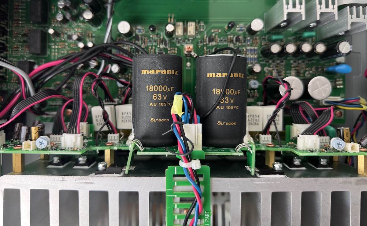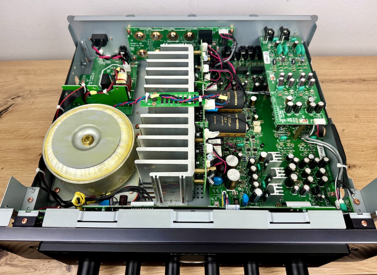 Der Marantz zeigt uns nach dem Öffnen des soliden Gehäusedeckels seine sauber aufgebauten, klassischen Class AB-Analogendstufen, die an 8 Ohm pro Kanal 70 Watt freisetzen und an 4 Ohm mit 100 Watt für jeden Kanal aufwarten können. Im Inneren stößt man auch auf die Hyper Dynamic Amplifier Module, kurz HDAM, von Marantz – eine Eigenentwicklung des Hauses, die einer ausgezeichnete Klangqualität sehr zuträglich ist.