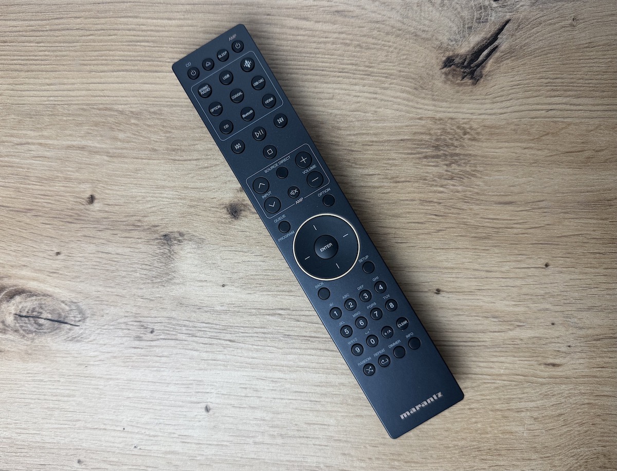 Der Marantz Model 50 kommt mit einer stabförmigen, elegant wirkenden Systemfernbedienung zum Kunden. Es ist exakt das identische Modell, das auch dem CD-Player/Streamer/Vorverstärker Marantz CD50n beiliegt. Daher kann man den CD50n ebenso steuern wie den Model 50 – die meisten der Bedienelemente sind sowieso für den CD 50n vorgesehen. Arbeitswinkel sowie Reichweite des IR-Gebers sind nicht zu kritisieren.