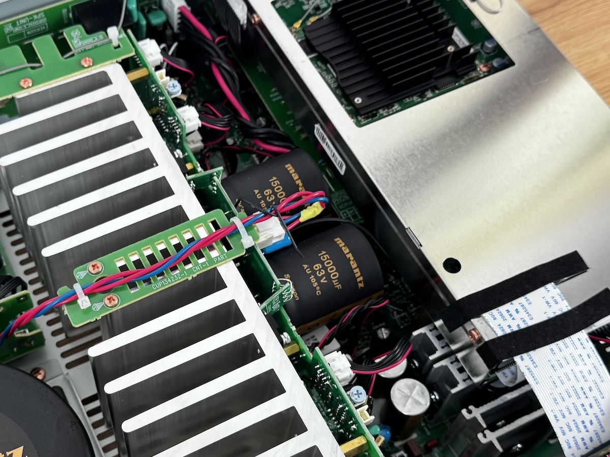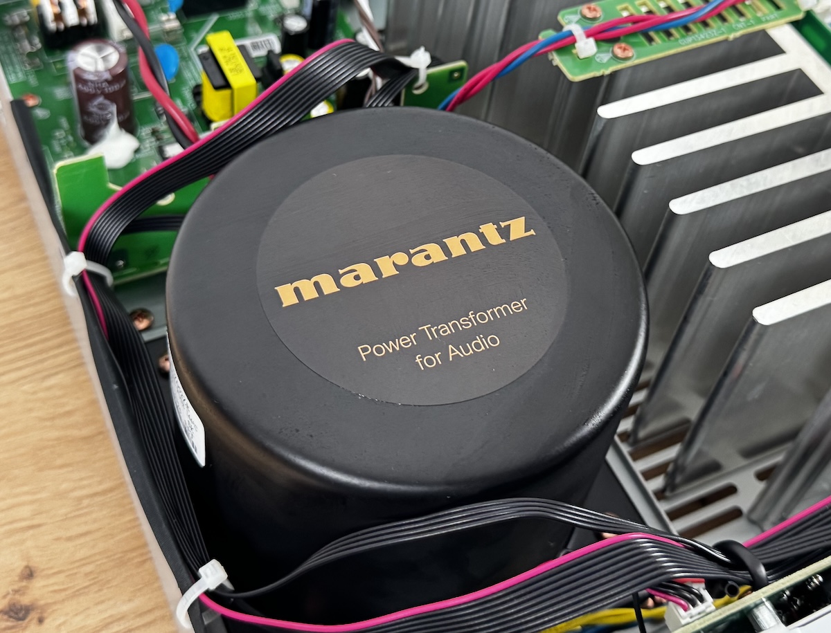 Im Inneren zeigt der Model 60n einen hochwertigen und audiophilen Aufbau. Der große und geschirmte Ringkerntransformator springt sofort ins Auge, für digitale Schaltkreise gibt es eine zusätzliche Stromversorgung. Außerdem gefällt der Kühlkörper, der mit massiven Aluminium-Rippen ebenfalls sehr solide daherkommt. Elektrolyt-Kondensatoren, versehen mit dem Marantz-Logo, in zweifacher Ausführung weisen eine Gesamtkapazität von 30.000 µF auf.
