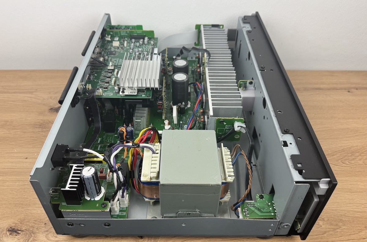 Zeit, mal in den ICON A-50 hineinzuschauen. Wir lösen den Gehäusedeckel – Achtung, als normaler Besitzer bitte nicht machen, dann erlischt der Garantieanspruch – und sehen uns an, wie der Streaming-Vollverstärker innen aufgebaut ist. Der Aufbau und die Bauteil-Qualität bezeichnen wir als preisklassengemäß – eine Aufteilung in verschiedene Kammern zwecks optimaler Störungs- und Resonanzarmut findet sich nicht. Der Trafo ist ausladend, es handelt sich aber nicht um einen Ringkerntransformator.