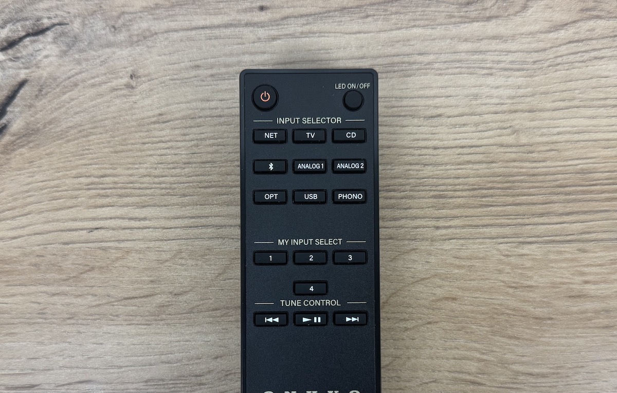 Die Fernbedienung ist zwar hinsichtlich ihrer Materialqualität nicht besonders hochwertig und entspricht somit dem üblichen Durchschnitt, sieht aber dafür elegant aus. In der obersten Reihe stoßen wir auf den Standby-Knopf und ein weiteres Bedienelement, um die LED-Beleuchtung am Verstärker wahlweise ein- oder auszuschalten. Es schließen sich dedizierte Tasten für die unterschiedlichen Quellen an.