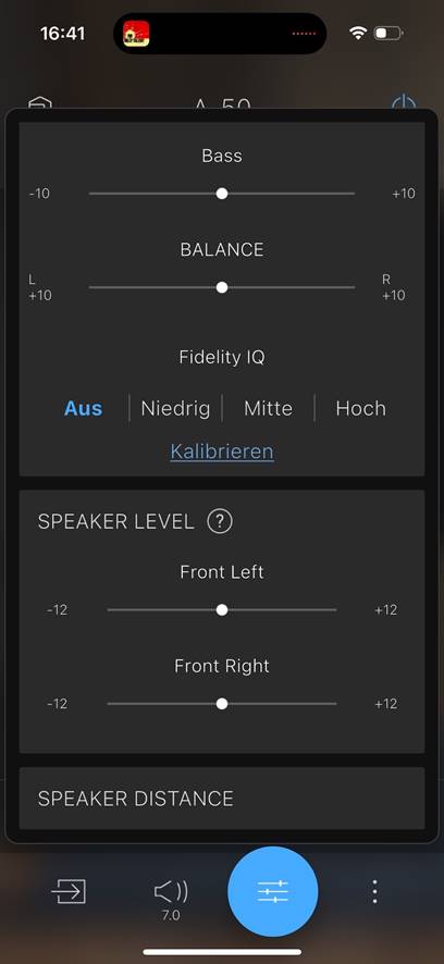 Wer TIDAL, Spotify oder Qobuz nutzt, benötigt die Onkyo-App nicht. Bei diesen drei Streaming-Musikdiensten ist jeweils die Connect-Version an Bord, sodass sich der A-50 direkt aus der betreffenden App des Streaminganbieters ansteuern lässt. In der App finden sich zahlreiche Punkte zur Geräteeinstellung, und man kann dem A-50 einen anderen Namen geben und ihm, inklusive passendem Hintergrundbild, einen Raum zuweisen. Darüber hinaus ist es möglich, innerhalb der Controller-App auf alle Quellen zuzugreifen. Hinzu kommen verschiedene Einstellmöglichkeiten für Höhen, Vokal/Dialog, Bass und Balance, auch den Pegel und die Distanz der beiden angeschlossenen Lautsprecher kann man manuell festlegen.