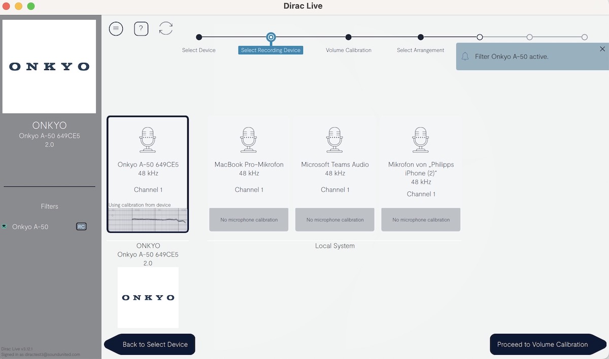 Wir haben Dirac Live auf unser Notebook geladen, ihr erlaubt, im Netzwerk nach kompatiblen Geräten zu suchen und dann mit der Einmessung begonnen. Das mitgelieferte Mikrofon kommt in den dafür vorgesehenen Anschluss beim ICON A-50 - der für die Dirac-Verwendung im Netzwerk registriert sein muss. Dann müssen wir in der Dirac-Anwendung exakt dieses Mikrofon auswählen, damit die Messungen korrekt ablaufen.