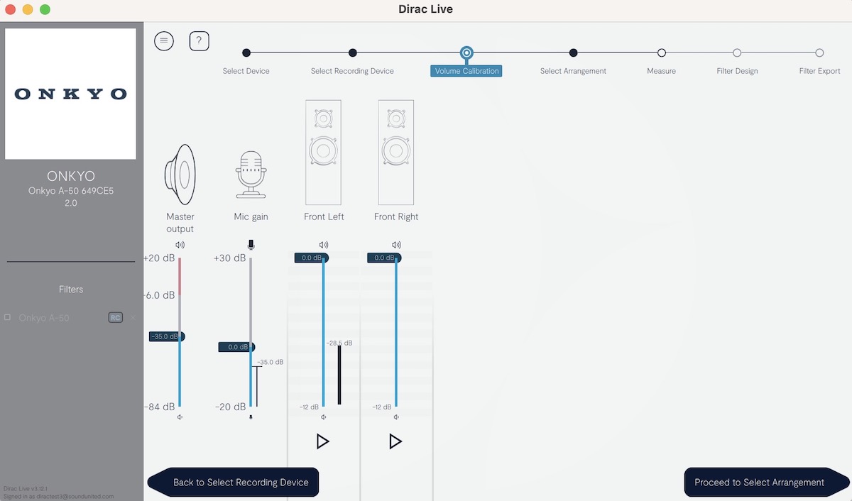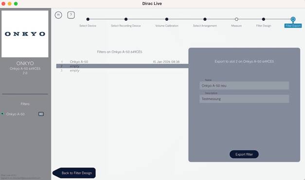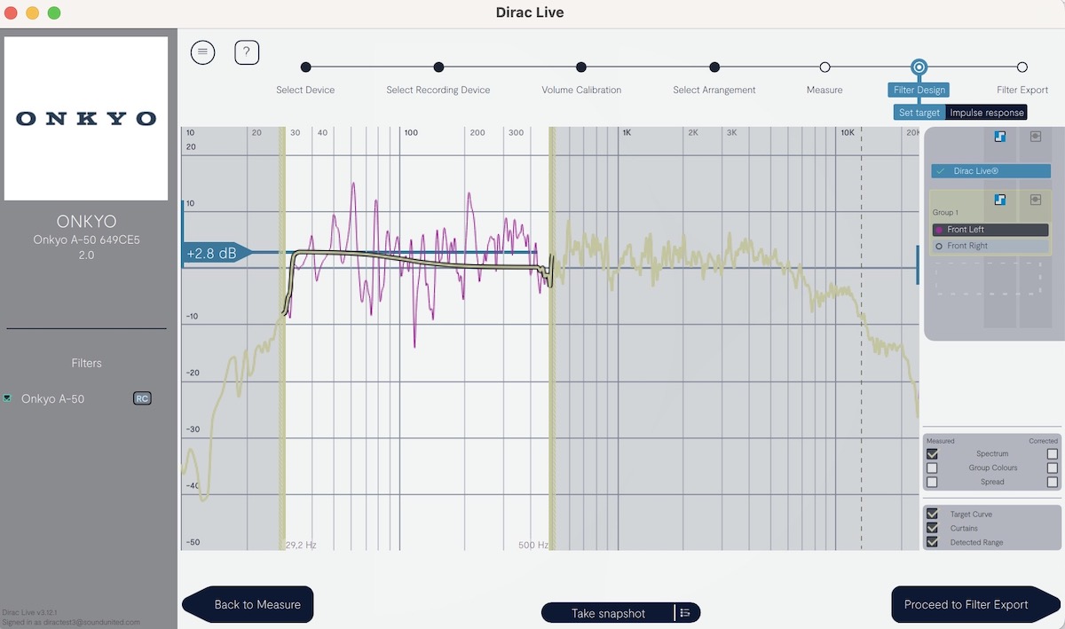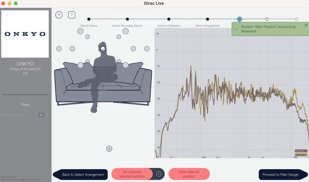 Nun, nachdem unsere Auswahl getroffen wurde, startet die Einmessung. Man hat sogar die Option, über die neun Hörpunkte hinaus noch weitere Einmessungen durchzuführen, oder man belässt es bei den neun Punkten. Anschließend kann man sich die von Dirac Live ermittelten Filter ansehen, und zwar getrennt für den linken und den rechten Kanal. Zu guter Letzt wird noch das Filterdesign gespeichert und auf den Onkyo übertragen.