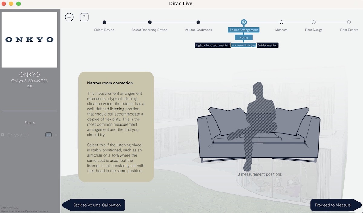 Nach Einstellung des Messpegels wird die Auswahl für den Sweet Spot erledigt, für den die Messung gelten soll. Hier kann man aussuchen: „Focused“ (ein Hörer auf einem festen Sitzplatz), „Wide“ (kleine Gruppe mit Hörern an verschiedenen Positionen, wie z.B. mehrere Personen auf der Couch) und „Expanded“ (größerer Sweet Spot für eine größere Personengruppe). Wir bestätigen die Option „Focused Sweet Spot“ und lassen die neun Messpunkte durchlaufen. Wählt man „Wide“ misst Dirac Live an 13 Punkten ein, bei „Expanded“ sind es 17 unterschiedliche Positionen, die eingemessen werden.