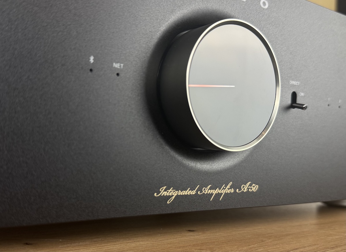 Der ICON A-50 gefällt uns auf Anhieb, seine optische Erscheinung ist modern und charakteristisch zugleich. Onkyo hat einen neuen, sehr stimmigen Marken-Schriftzug entwerfen lassen, und der zentrale Drehregler für die Lautstärke sieht äußerst elegant aus. Er ist motorisch betrieben und darüber hinaus beleuchtet.