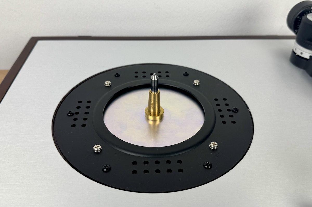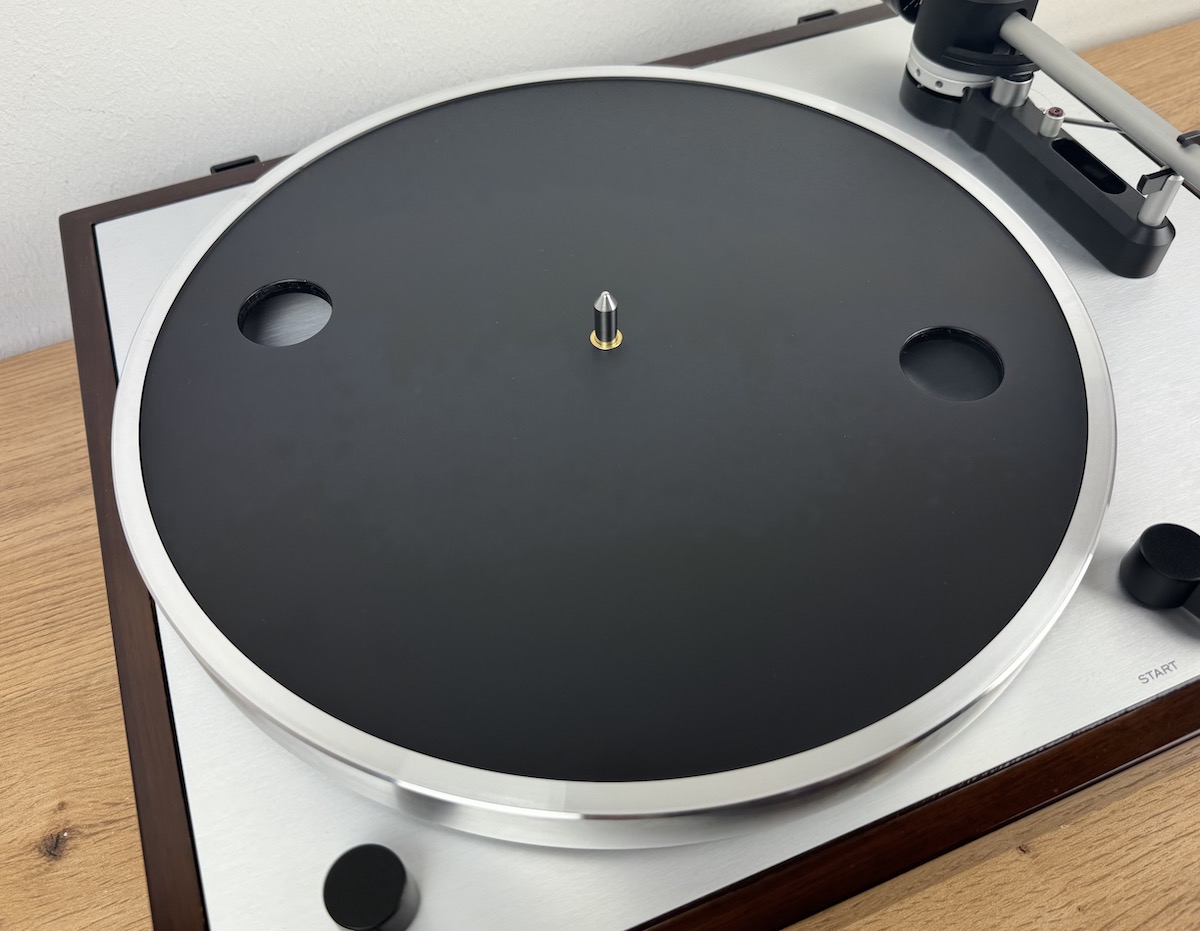 Wenden wir uns zuerst dem Laufwerk zu. Hier begeistert uns die hervorragende Verarbeitungsqualität mit hochwertigen Werkstoffen. Vorne links findet sich der Umschalter für die Geschwindigkeit (33/45 Umdrehungen), rechtsseitig untergebracht ist der Kippschalter für Starten und Stoppen der Wiedergabe. Der Plattenteller, 1,4 kg schwer und 22 mm dick, wird aus Aluminiumdruckguss gefertigt, die rutschfeste Gummimatte wird auf diese Konstruktion aufgelegt.