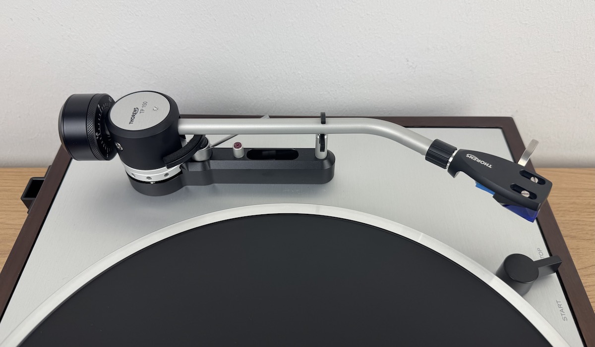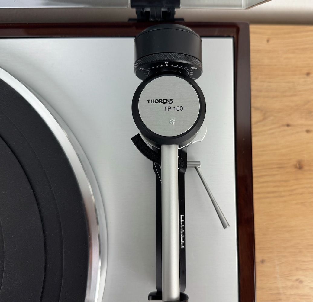 Fahren wir mit dem Tonarm fort. Der TD 403 DD verfügt über einen von Thorens mit großem Aufwand und enormer Sorgfalt entwickelten Tonarm TP 150. Dieser kommt auch im Modell TD 1500 zum Einsatz. Der Tonarm besitzt eine effektive Masse von 14 Gramm und ist höhenverstellbar. Auch der Azimuth kann justiert werden. Bedingt durch den Standard SME-Anschluss ist der Wechsel der Headshell oder die Verwendung eines anderen Tonabnehmer-Systems kein Problem.