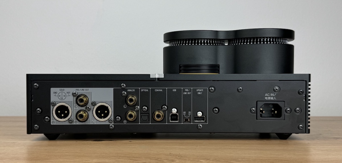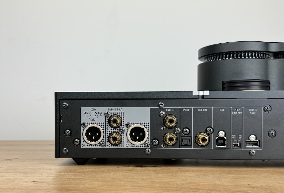 Der 5-polige symmetrische 4,4 mm Anschluss wird von Yamaha mit PENTACONN-Verbindern bestückt. Auf der Rückseite des HA-L7A finden sich weitere Anschlüsse. So USB-B und auch ein optischer sowie ein koaxialer Digitalanschluss. Ein analoger 2-Kanal-Cincheingang und, als Ausgänge, ein symmetrischer und ein asymmetrischer Stereo-Pre-Out vervollständigen das Angebot.