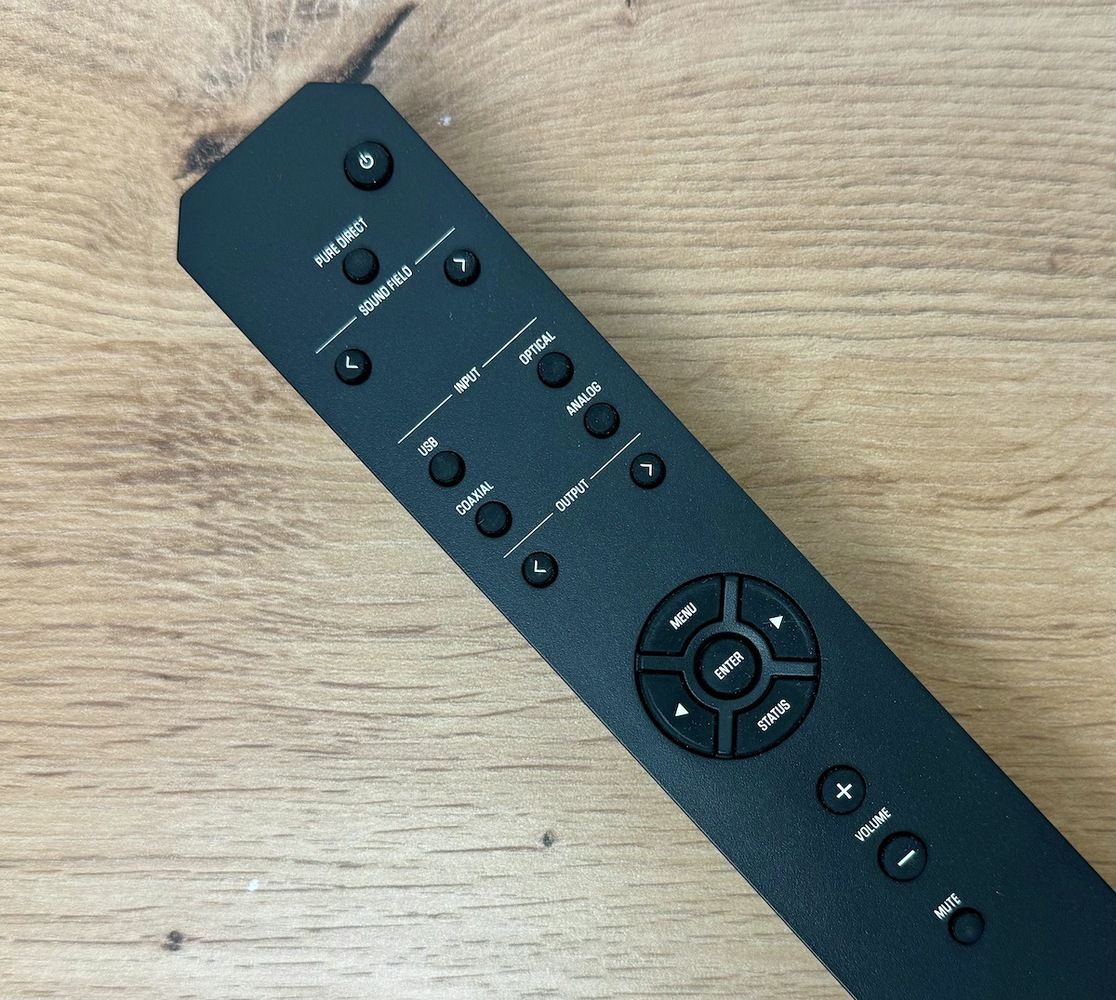 Wer den HA-L7A ersteht, bekommt auch eine stabförmige Fernbedienung mitgeliefert. Sie wirkt allerdings weniger nobel als das Hauptgerät, erweist sich in der Praxis aber als komfortabel bezüglich der Verwendung. So kann man mittels des Signalgebers, der in Schwarz gehalten ist, beispielsweise den Pure Direct-Modus aktivieren oder die DSP-Felder umschalten.
