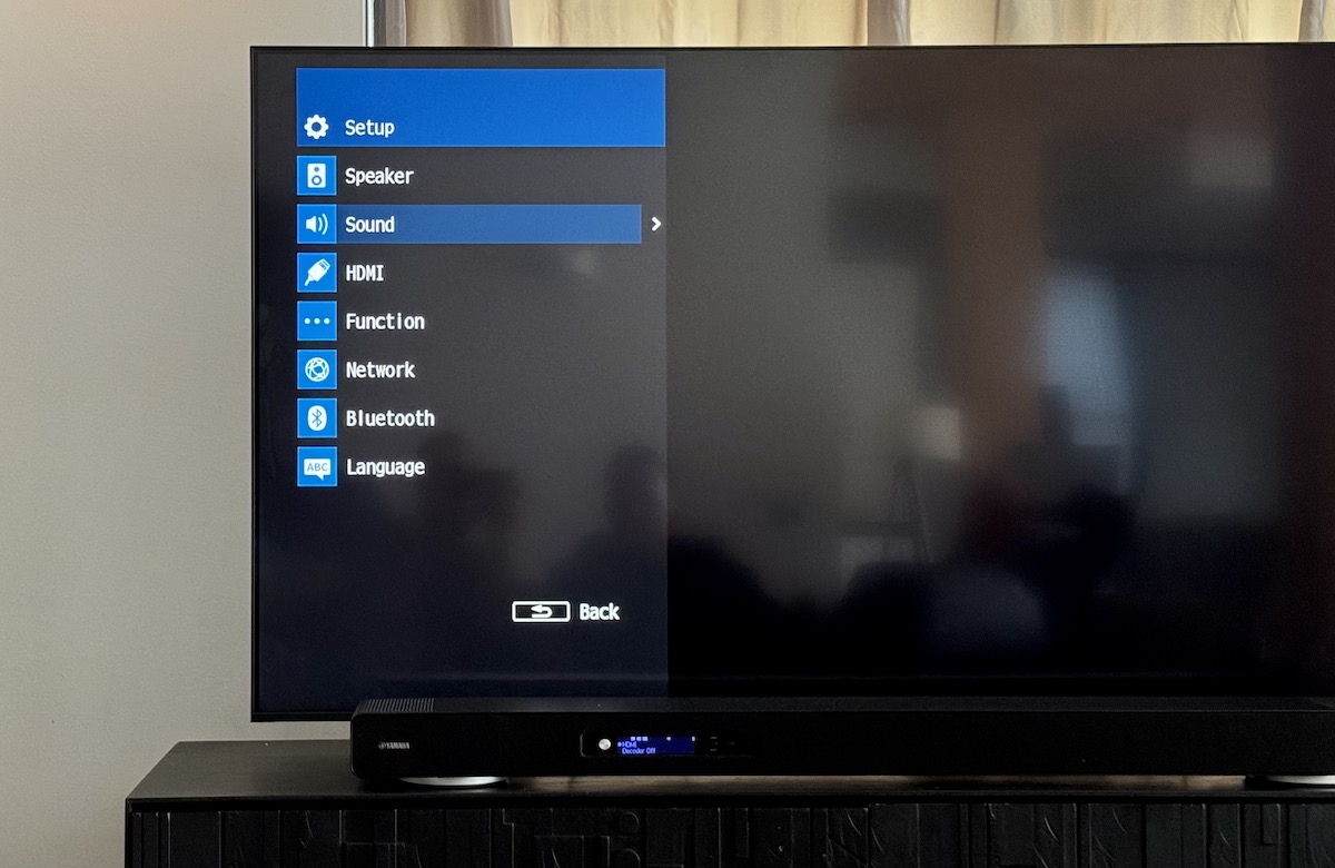 Ein grafisch eher schlicht und zweckmäßig gehaltenes On Screen-Menü für sämtliche Einstellmöglichkeiten gehört auch zum Ausstattungsumfang der Yamaha True X Surround 90A. Das Setup umfasst die Untermenüs „Lautsprecher“ (für Beam-Strahl inklusive Winkel/Brennweite/Deckenhöhe, Pegel), „Ton“, „HDMI“, „Funktion“, „Netzwerk“, „Bluetooth“ und „Sprache.