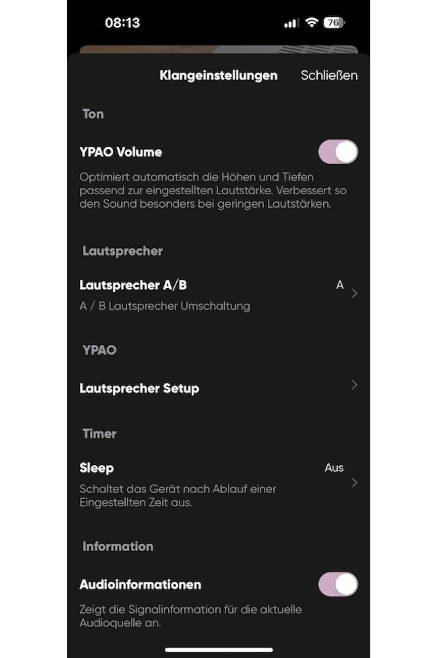 Mit der MusicCast App kann auch die Einrichtung des Yamaha Streaming-Receivers erfolgen. Schritt für Schritt wird man durch die Installation geführt, bindet das Gerät ins Heimnetzwerk ein, nimmt Lautsprechereinstellungen vor und kann die Ergebnisse der YPAO Raumeinmessung einsehen oder gar korrigieren.