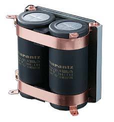 Als Kurzzeitspeicher werden Kondensatoren eingesetzt, die bei sehr hochwertigen AV-Komponenten über viel Speicherkapazität verfügen. Im Bild das Kondensatoren-Doppelpack des Marantz SR7009.