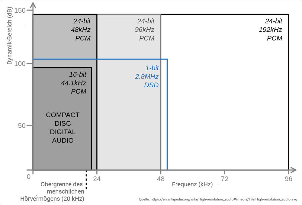 Ungefährer Dynamikbereich und Bandbreiten der gängigsten hochauflösenden der Audioformate