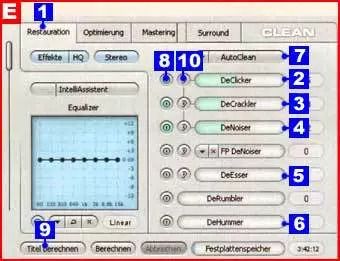 Unter "Restauration" [1] finden Sie Filter zur Bearbeitung des Tonmaterials. Der so genannte Declicker [2] entfernt Knackser, die auf verkratzten Vinylplatten zu hören sind. Auch wenn sich bei der Aufnahme andere Elektrogeräte einschalten, etwa der Kühlschrank, entstehen solche Knackser. Der Decrackler [3] beseitigt konstantes Hintergrundknistern. Der Denoiser [4] wiederum empfiehlt sich insbesondere zur Bearbeitung der Musik von Tonbändern, da er Hintergrundrauschen zu Leibe rückt. Mit der Funktion Deesser [5] entfernen Sie Zischlaute. Dehummer [6] wirkt dem Netzbrummen auf der Stromfrequenz von 50 Hz entgegen. Das Programm kann selbst entscheiden, welche dieser Werkzeuge sinnvoll sind. Der Klick auf "Autoclean" [7] startet die Analyse des Songs. Schalten Sie die gewünschten Werkzeuge ein, indem Sie auf den linken Knopf [8] eines Tools klicken, so dass es sich blau einfärbt. Nun noch "Titel berechnen" [9] anklicken, und die Analyse beginnt. Der Knopf mit dem Ohr [10] startet die Funktion "Vorhören" und spielt nur die Geräusche vor, die das Programm entfernt. Entscheiden Sie selbst, ob die Einstellung zu hoch gewählt ist und Teile der Musik eliminiert würden. Nur Kratzer, Knistern und andere störende Geräusche sollten zu hören sein.