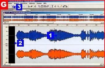 Bevor Sie die Musik auf CD brennen, gibt es noch ein paar Kleinigkeiten zu erledigen. Ein Doppelklick in ein Feld unter der Zeile "Titel", und die Zelle ist blau unterlegt. Sie können jetzt den Songtitel eintippen. Damit druckt der Labeleditor von CLEAN später die Hülle der CD. Manche Songs müssen noch geschnitten werden - am Anfang und Schluß sind vielleicht zu lange Pausen entstanden. Ist der Song im Arbeitsfenster aktiv, öffnet ein Klick auf "Editor öffnen" das Programm Wavelab [G]. Die Songs erscheinen hier in Hüllkurven [1]. Klicken Sie mit der linken Maustaste an die Stelle, die den Beginn des Songs markiert, und ziehen Sie mit gedrückter Maustatse den Cursor an den Rand des Arbeitsfensters. Die Pause erscheint schwarz [2] unterlegt und verschwindet nach einem Klick auf das Symbol mit der Schere [3]. Falls nicht schon bei der Restaurierung geschehen, klicken Sie im letzten Arbeitsschritt auf "Titel berechnen". Eine grüne Titelnummer zeigt an, dass der Vorgang abgeschlossen ist. Erst jetzt ist der Song im CD-Format und damit auf der Stereo-Anlage abspielbar.